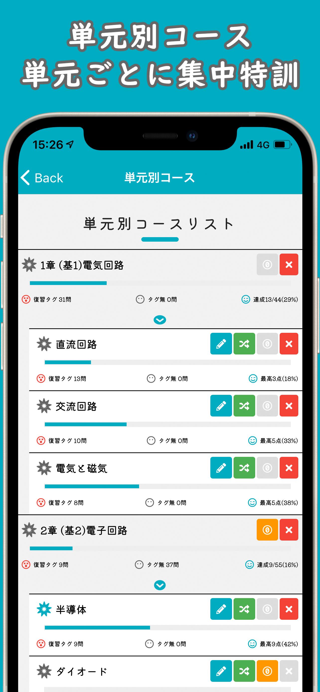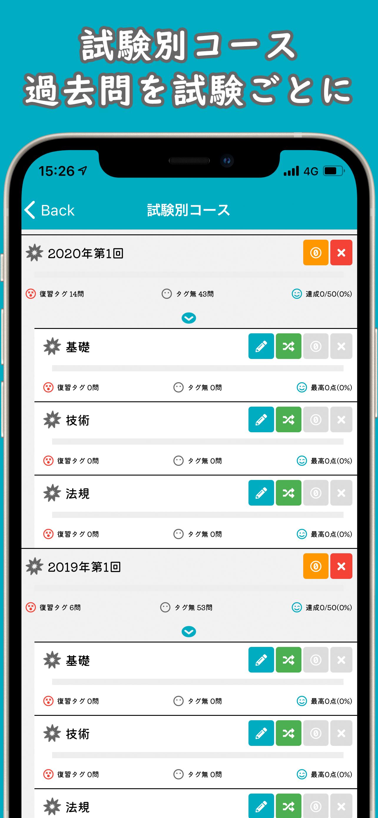 ・ "Unit-specific course" allows you to solve past problems by dividing them into units. Understanding is surely deepened by solving similar problems such as calculation problems and legal problems together.