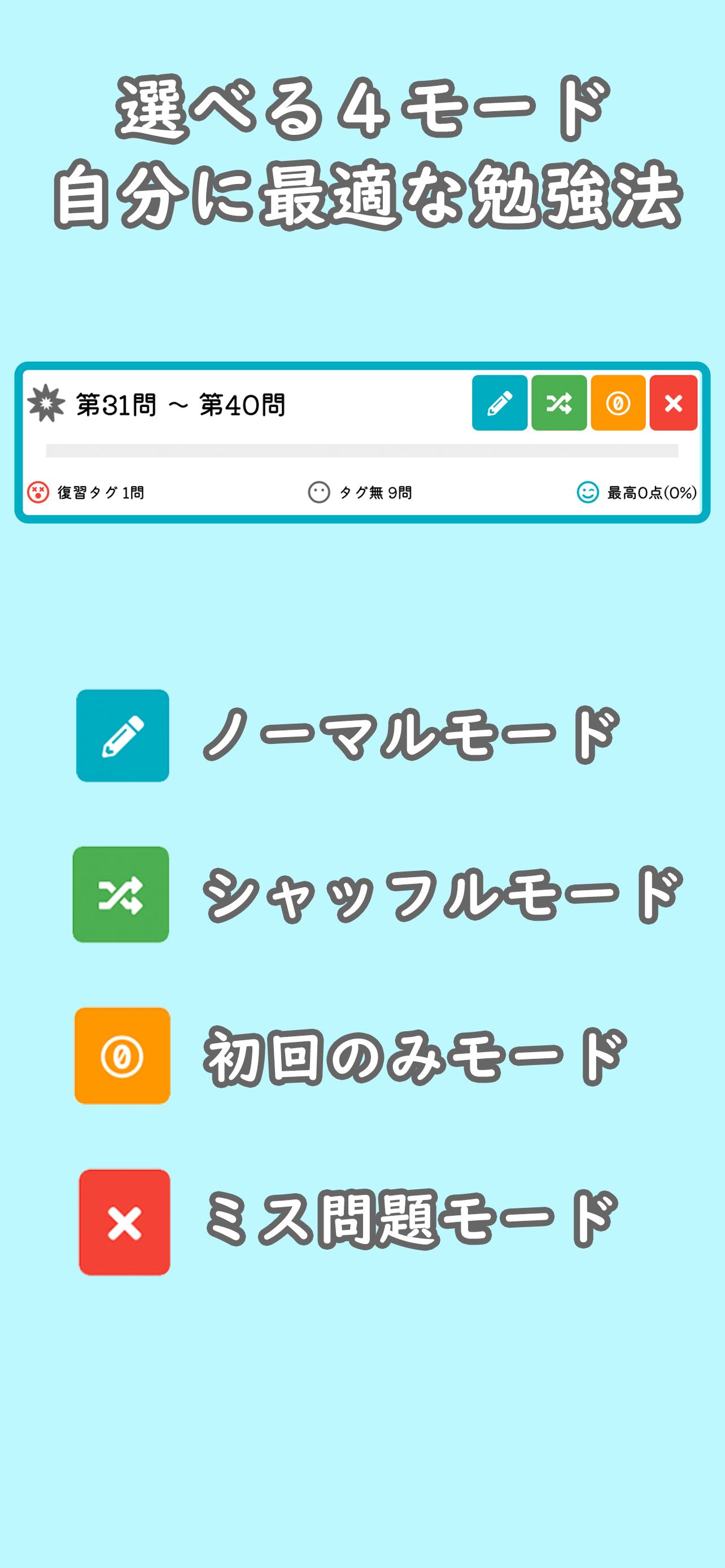 ・ In "Shuffle mode", the questions are the same as in normal mode, but the order in which the questions are asked is random. Prevents you from remembering the answers in the order of the questions.