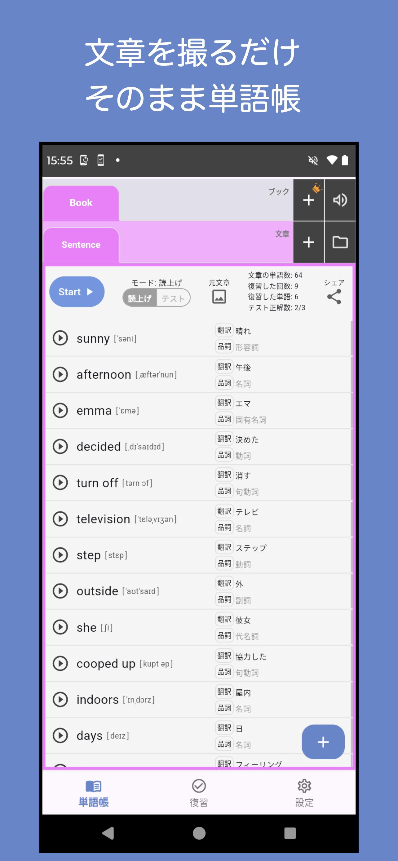 This app allows you to extract words by simply taking a picture of a sentence and easily create a vocabulary list.