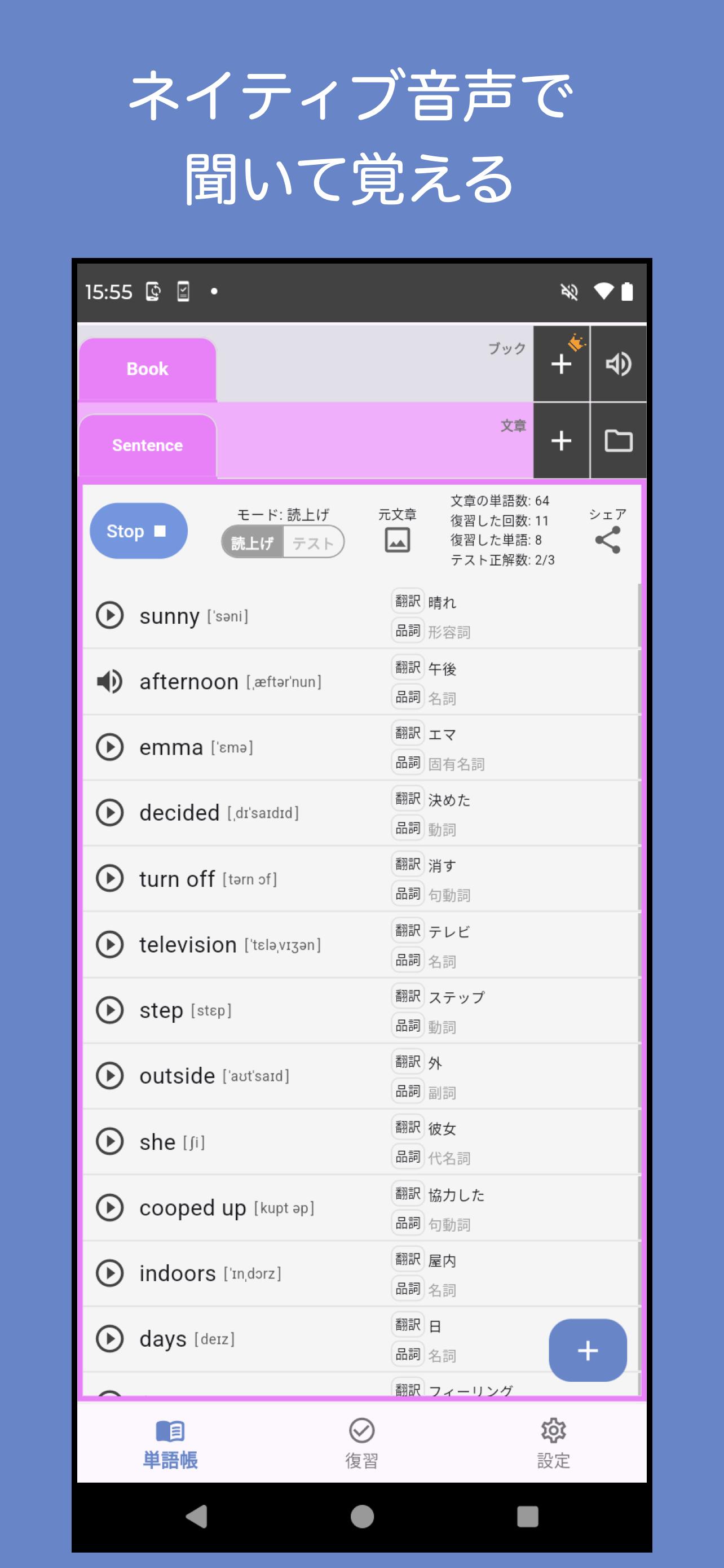 This app allows you to extract words by simply taking a picture of a sentence and easily create a vocabulary list. You can use all the basic functions completely free of charge, with no login required.