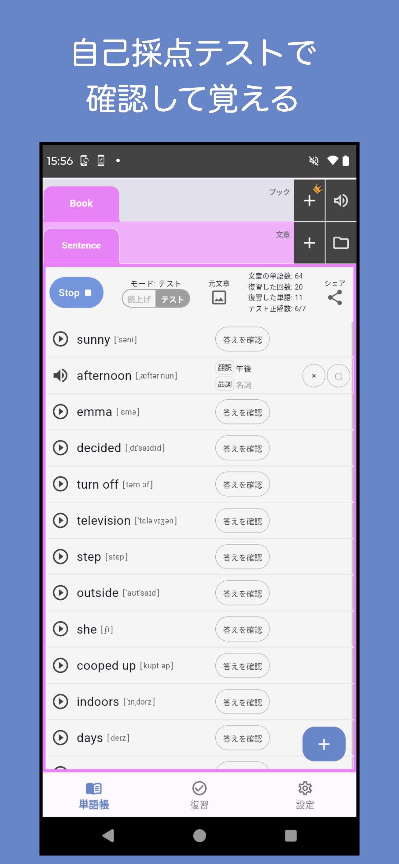 The words will be read out in order from the top, so once you understand them, press the "See Answer" button, rate yourself, and press the ○× button for the result.
