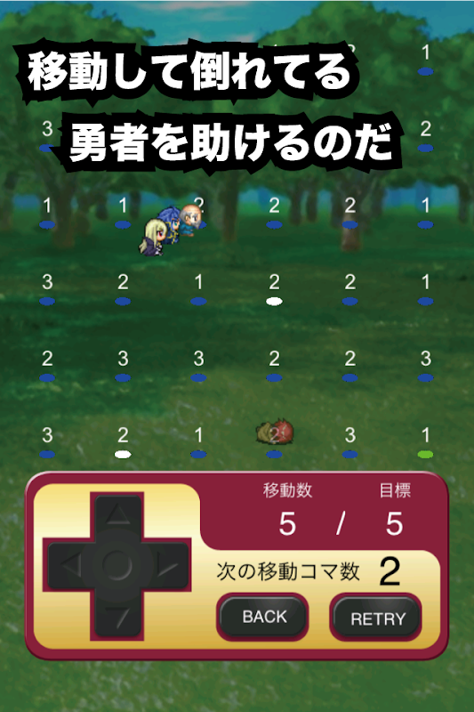 ・森にはマスがあり、それぞれ数字があります。その数字が次に移動するマス数なので、村長をうまく移動させて、勇者達を全員助けてください。 ボスが出現したら、そこまで移動するとバトルがはじまります。