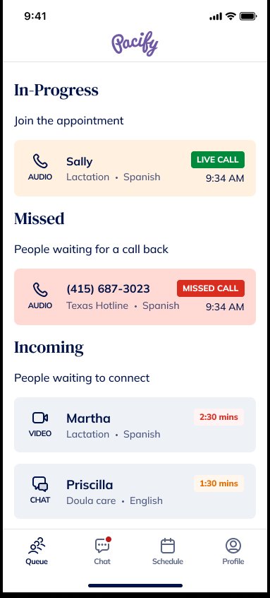iProvider 应用程序允许经批准的 Pacify 提供商与新父母进行 1:1 联系,以针对婴儿喂养问题提供 24/7 的按需护理。