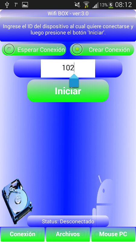 2) un dispositivo con la opción "Esperar Conexión" y luego el botón iniciar y recuerde el número ID que muestra la pantalla.