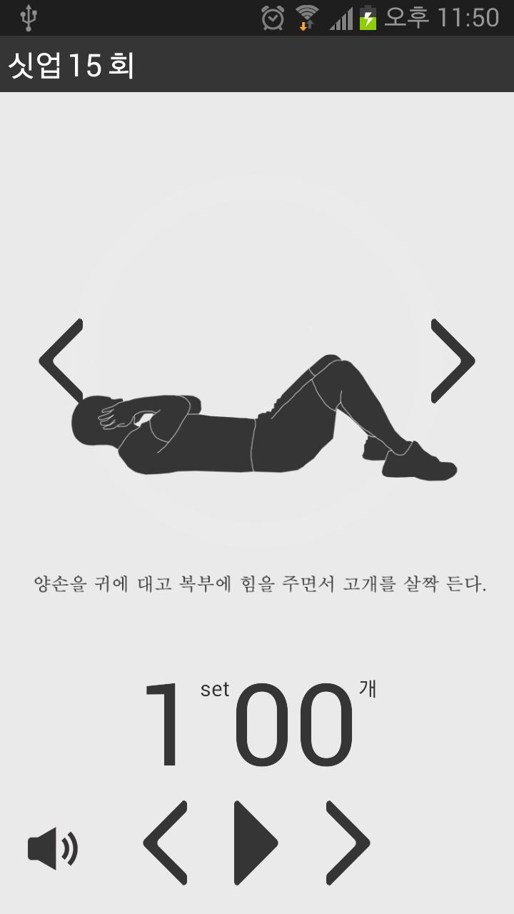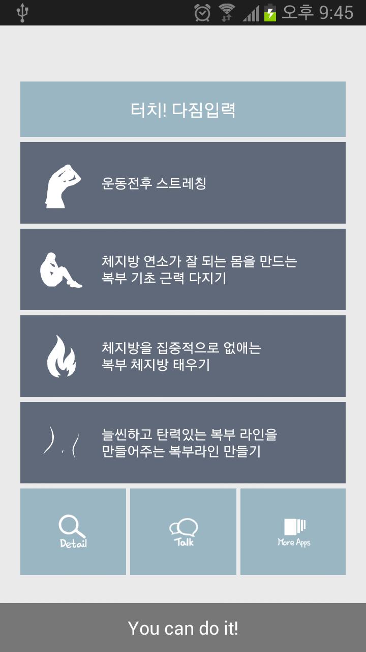 운동전후 스트레칭과 운동을 복부 기초근력 다지기(체험판), 복부 체지방 태우기(정식버전), 날씬한 복부라인 만들기(정식버전) 3가지의 단계로 운동을 구분하였고 사용자가 원하는 운동을 선택할수 있으며 운동시 자세설명은 물론 어플의 카운팅소리와함께 운동할수있습니다.
