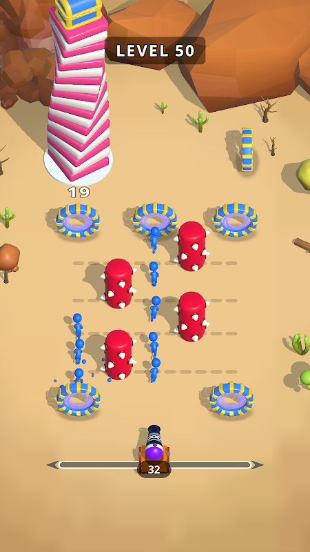 Passe die Hindernisse an, um den Weg für die Truppen zum Stapel zu machen. Zerstöre den Stapelturm und gehe zum nächsten Level über.