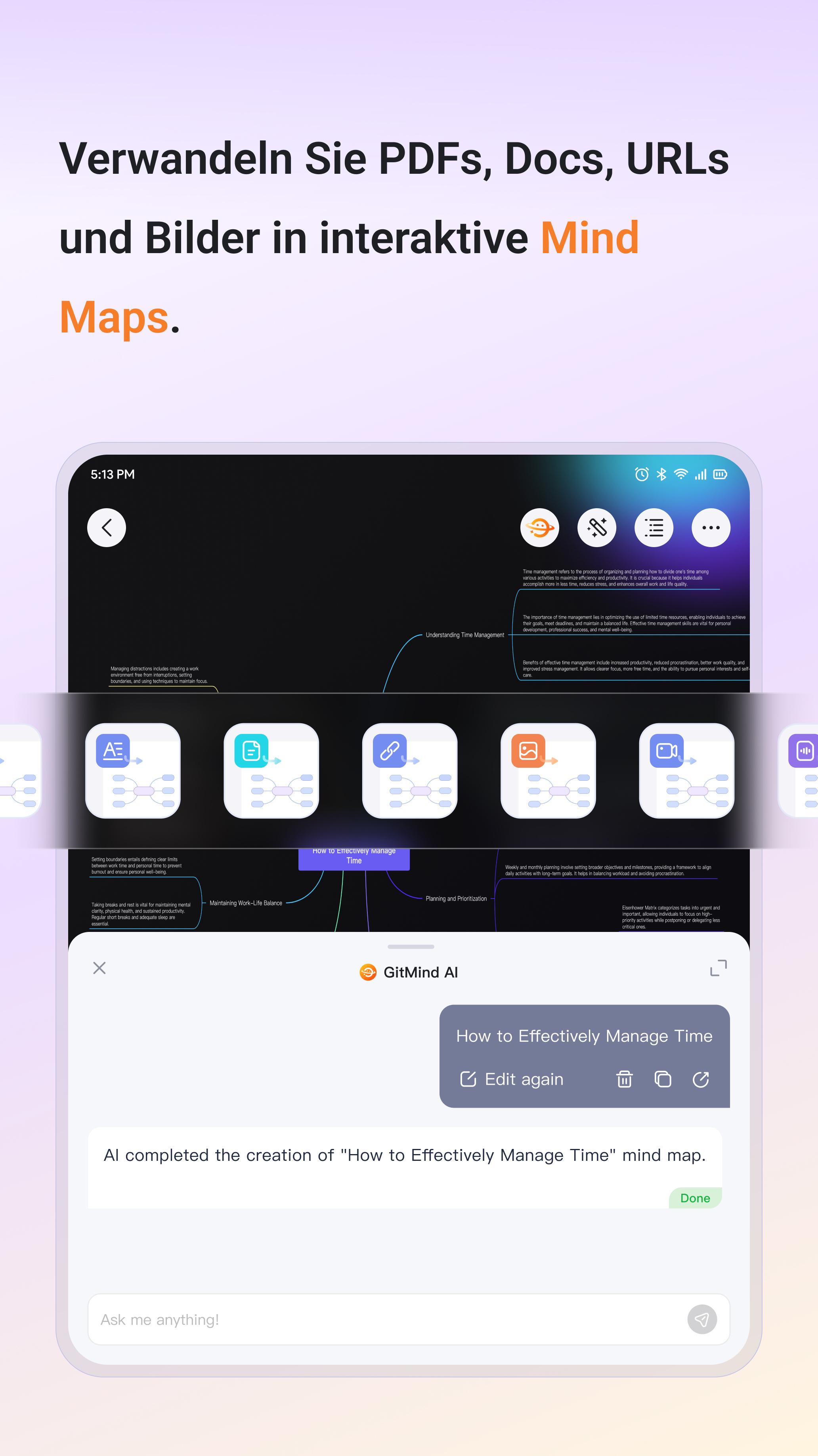 • PDF-Zusammenfassung: Extrahiert die wichtigsten Punkte aus PDFs und wandelt sie in visuelle Mindmaps um.