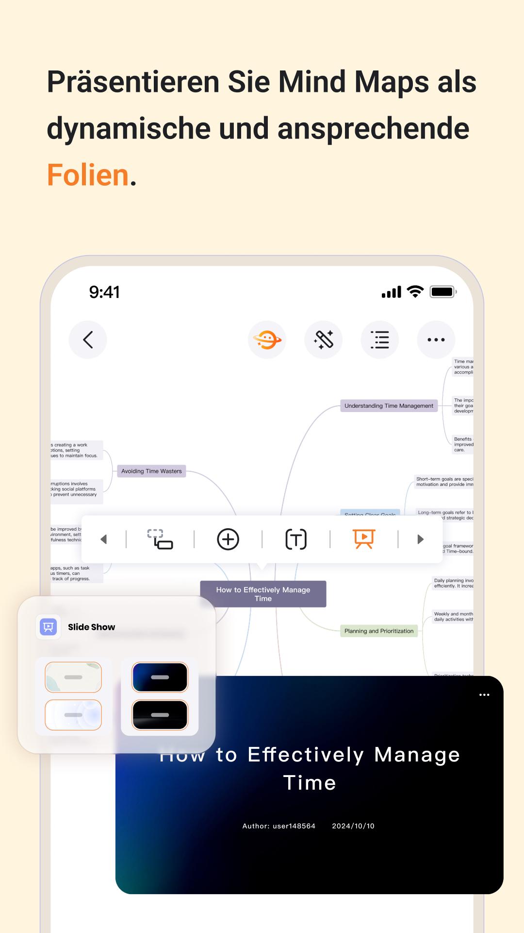 • Präsentationsmodus: Präsentieren Sie Ihre Mindmaps als interaktive Diashow – ideal für Meetings, Vorlesungen und Brainstorming.