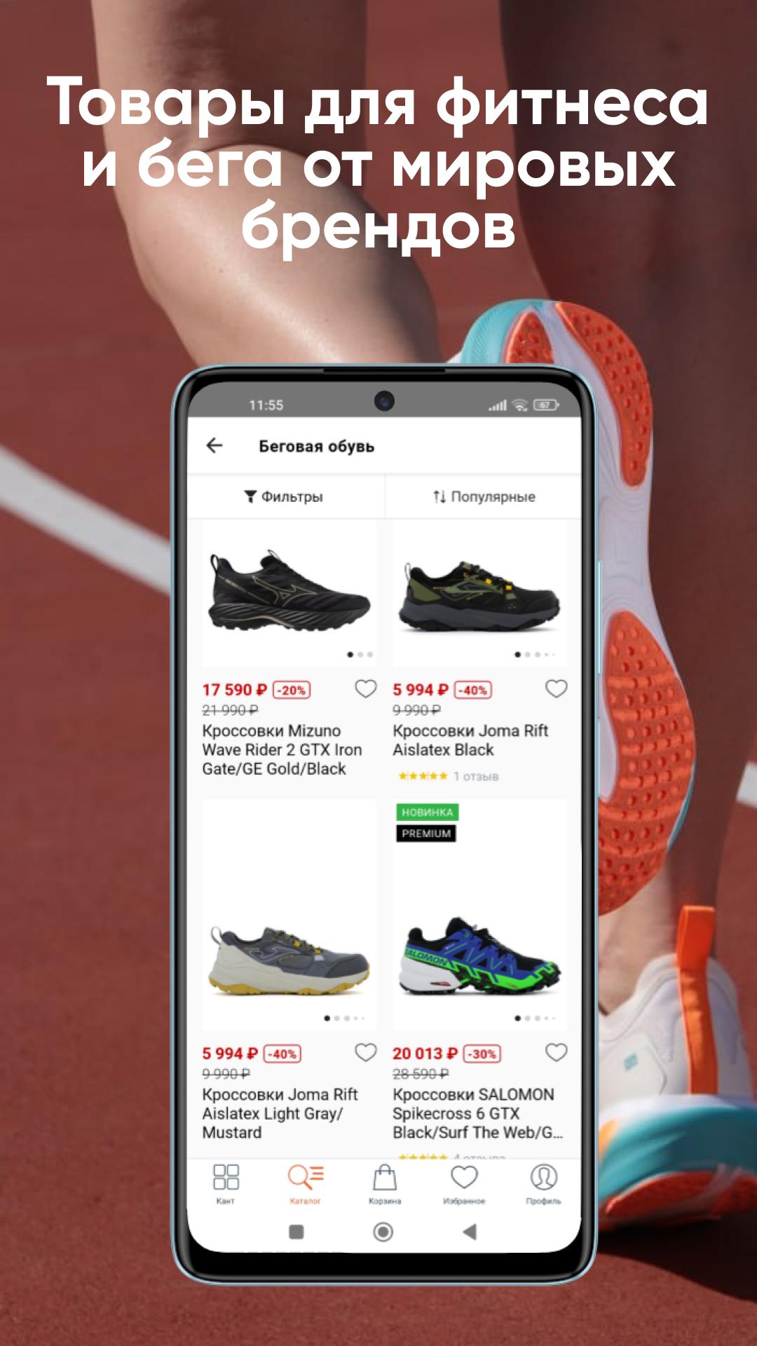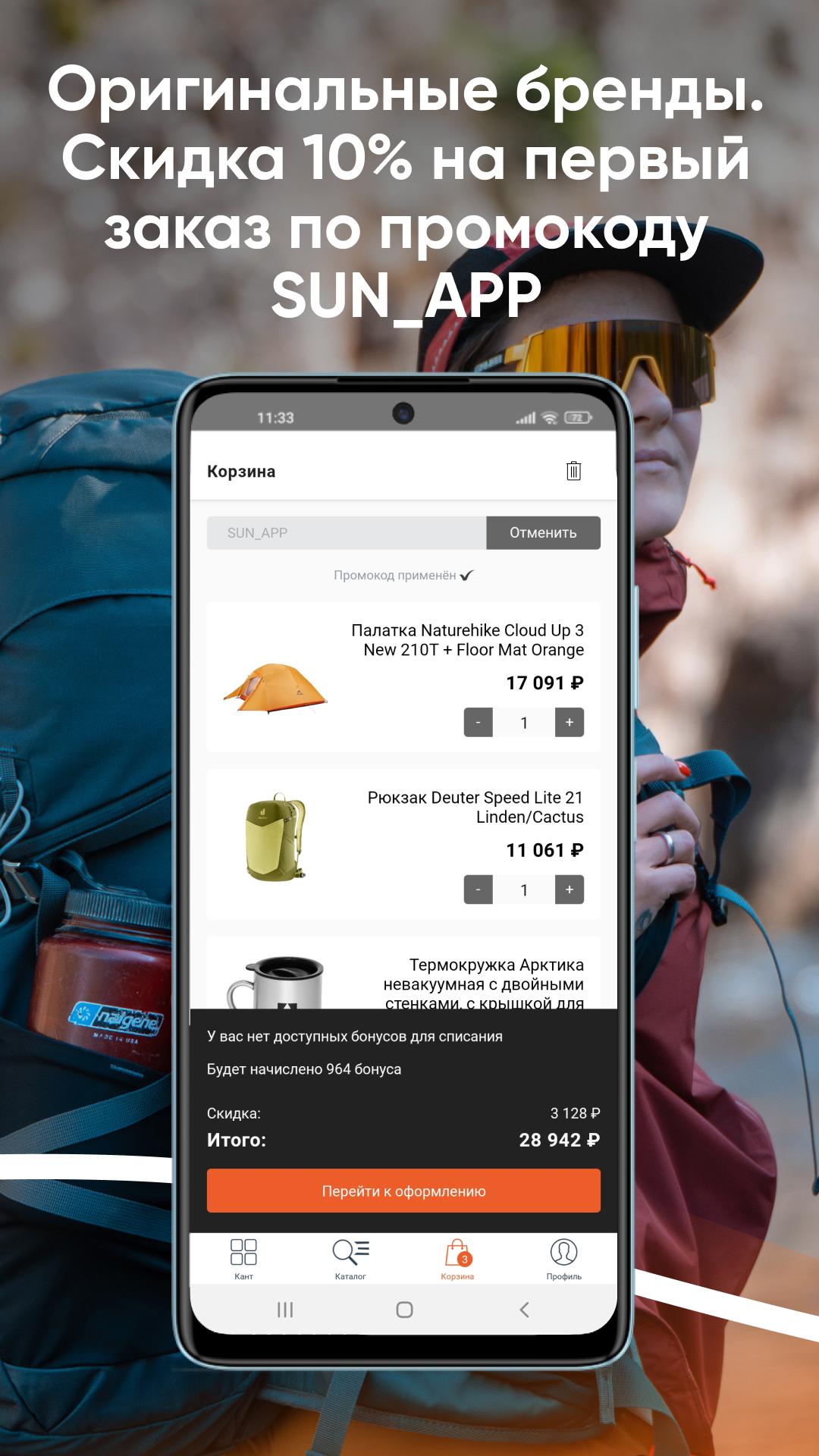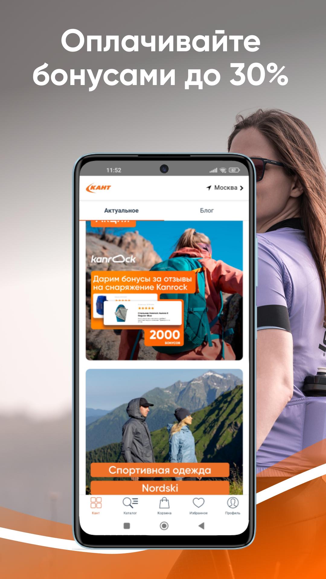 Descarga la app de Kant, elige ropa deportiva y zapatillas de running, mochilas, tiendas de campaña para actividades al aire libre, bicicletas, patinetes, skates, ¡consigue descuentos y acumula bonificaciones!