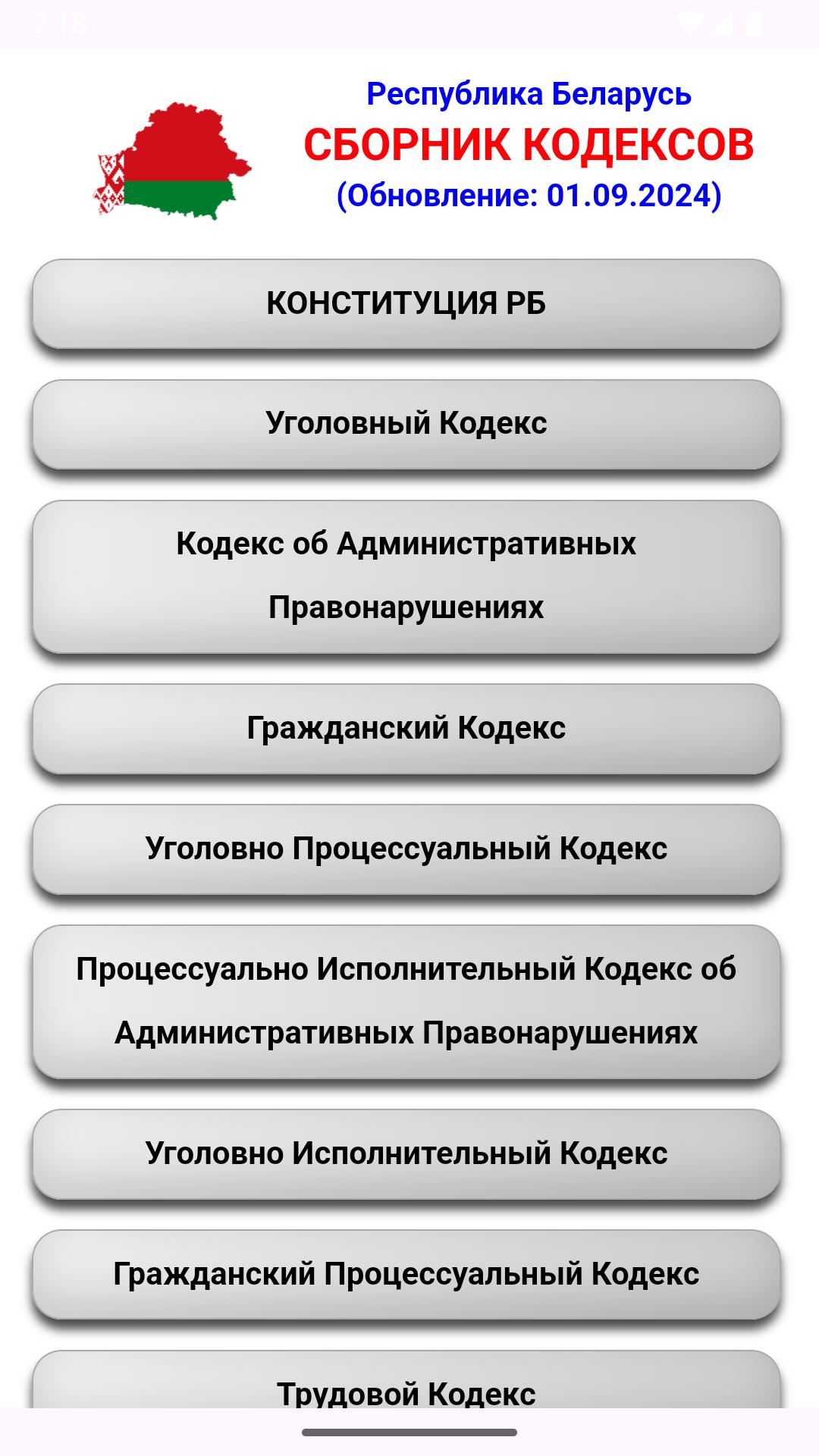 Colección de códigos de Bielorrusia: esta aplicación cubre todos los códigos legislativos (legislación básica) de la República de Bielorrusia. Lista de códigos: