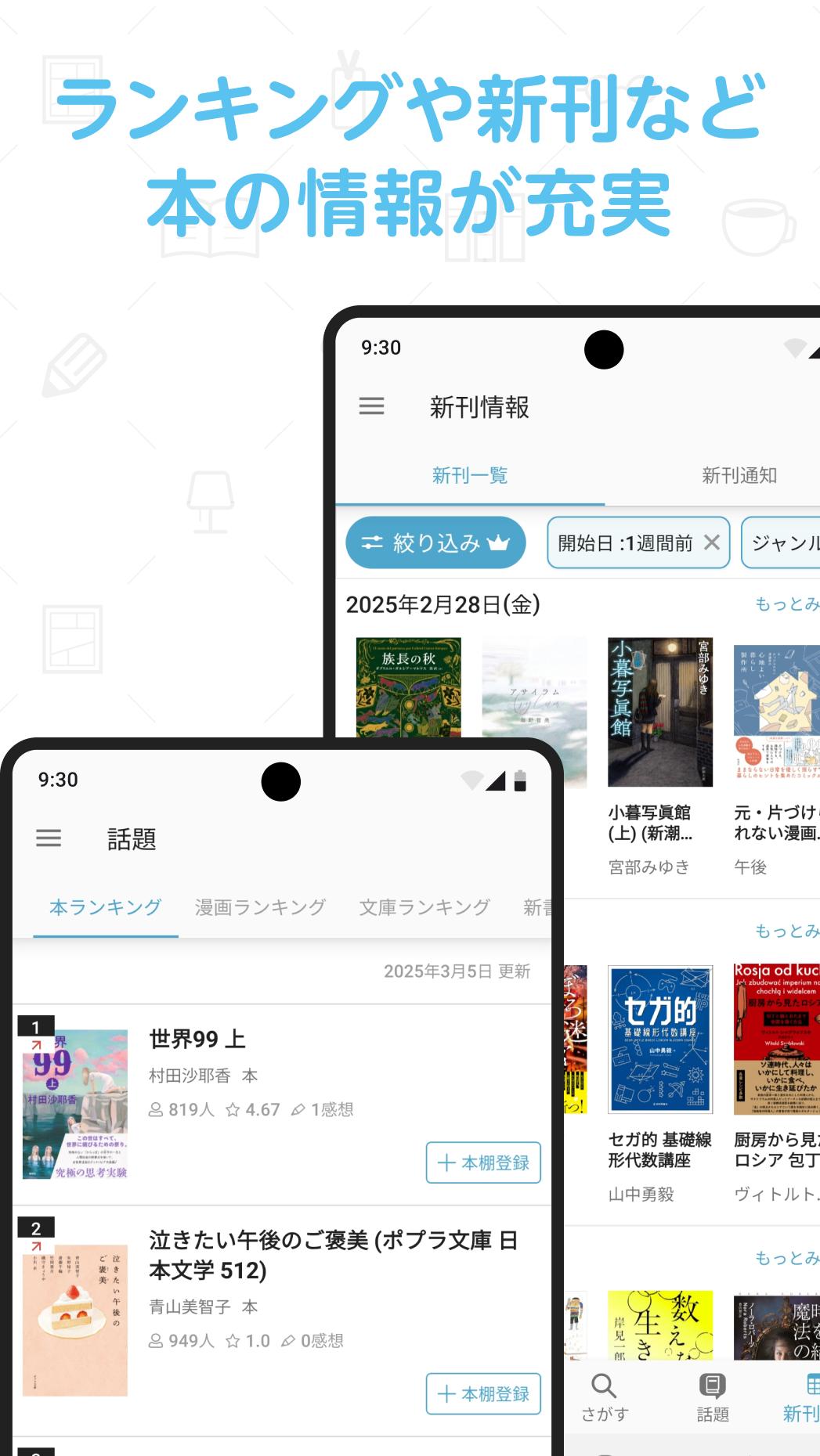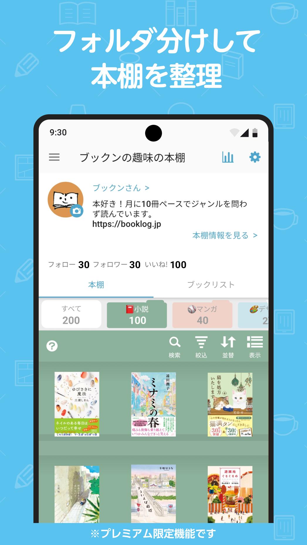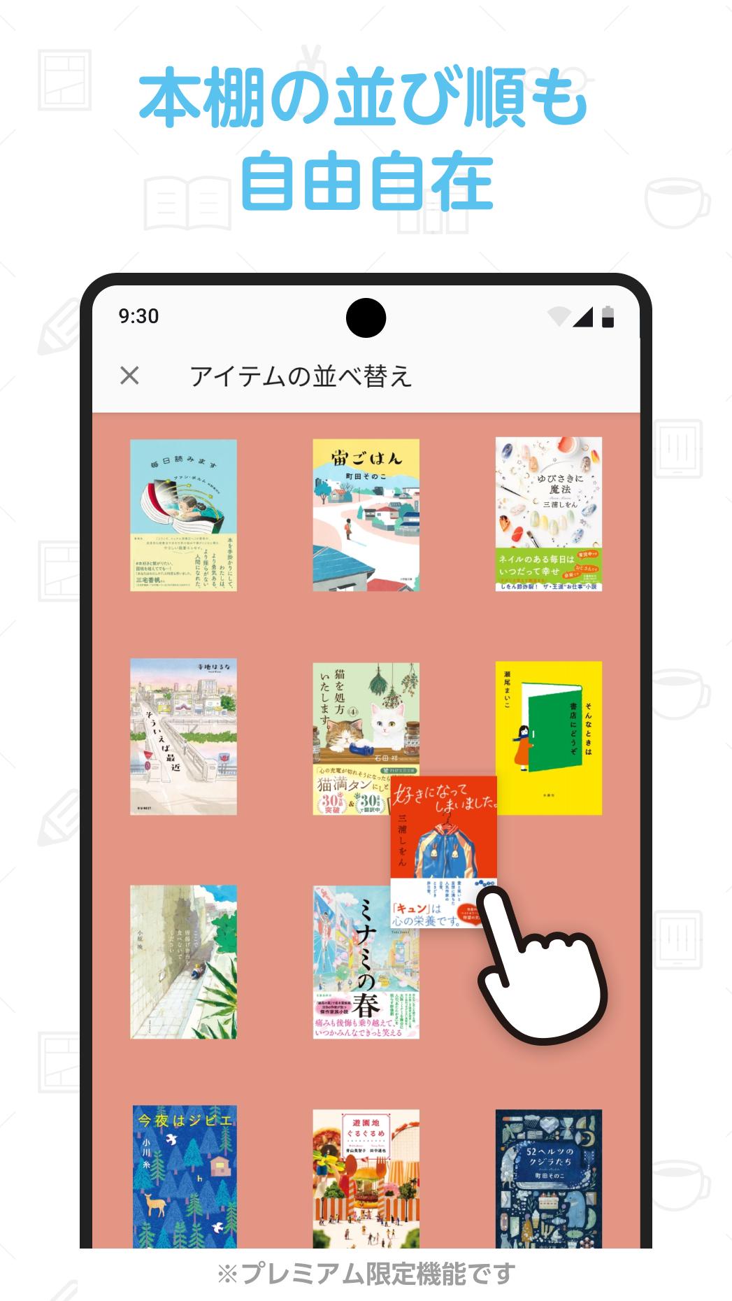 ・Organiza los libros en una estantería que muestra las portadas de forma destacada.・Ordena por fecha de registro o fecha de lanzamiento.