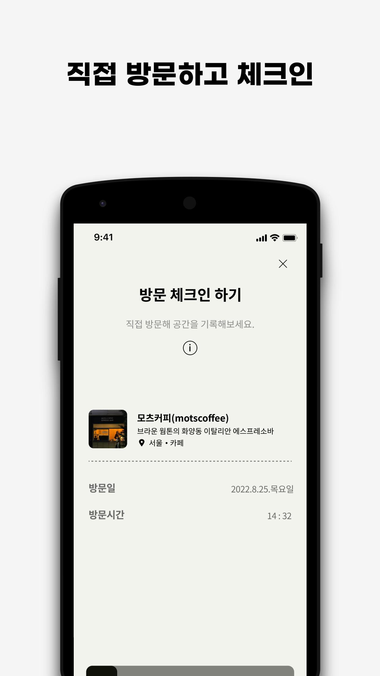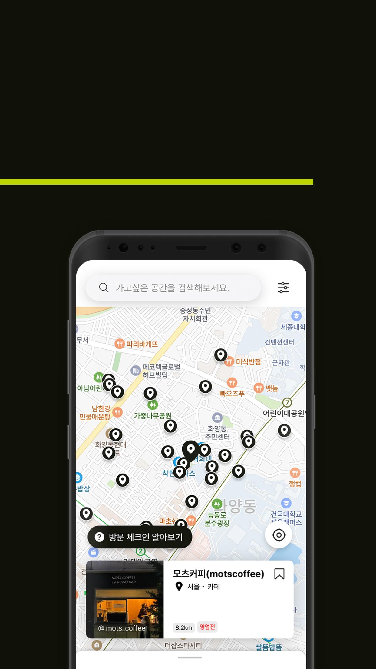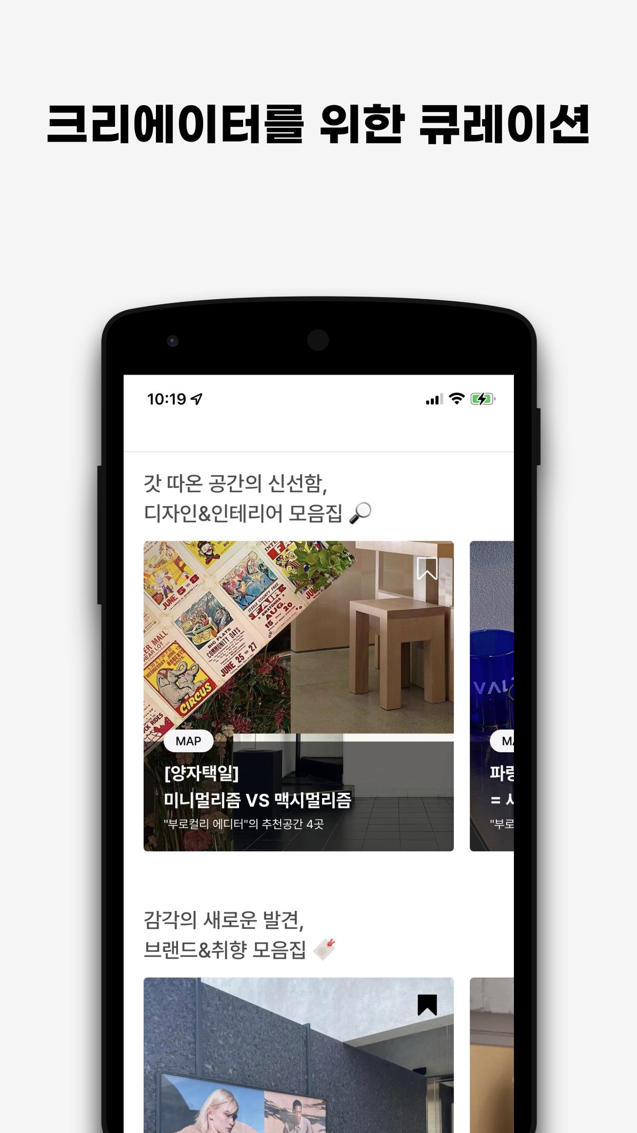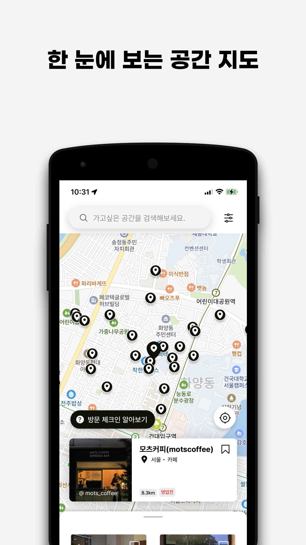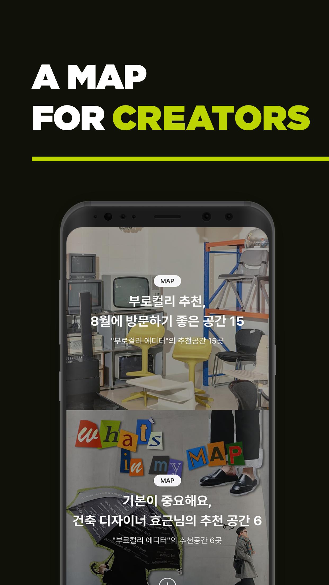 Puedes consultar el espacio seleccionado de un vistazo a través del mapa. Experimente la historia del espacio explicada directamente por el diseñador arquitectónico y los detalles del espacio inspirados por diseñadores, editores de revistas y especialistas en marketing. Contiene espacios en 100 ciudades como Seúl y la isla de Jeju. Además, si tiene curiosidad sobre el espacio que visita, ¡se cambiará a un ícono exclusivo de la sublocalidad! Puedes crear tus propios mapas inspiradores.