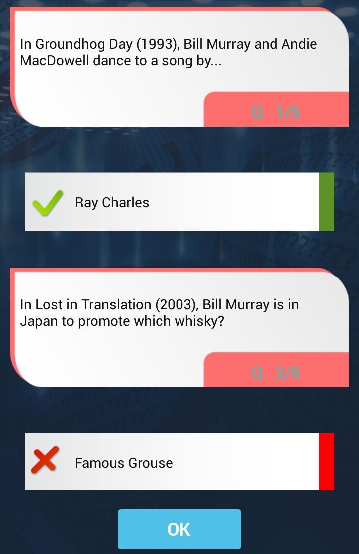 This is a fun quiz game where you answer the questions related to the Bill Murray. There are different levels in Bill Murray quiz game, each level contains many interesting questions about Bill Murray You need to achieve the required criteria to unlock the levels. Bill Murray trivia is interesting, quick and easy to use.
