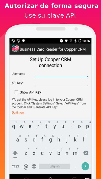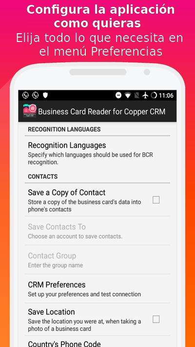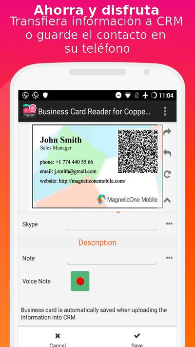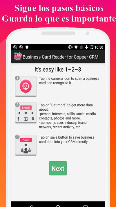 Lector de tarjetas de visita para Copper CRM es la solución más fácil, rápida y segura para transferir información de tarjetas de visita en papel a los sistemas CRM utilizando la cámara de su teléfono inteligente. Tome una fotografía de una tarjeta de negocios y la aplicación escaneará y exportará instantáneamente todos los datos de la tarjeta directamente a su CRM. Además, esta aplicación lo ayudará a aprender más sobre un posible cliente, socio o colega. Es una de las mejores aplicaciones para sistemas CRM.