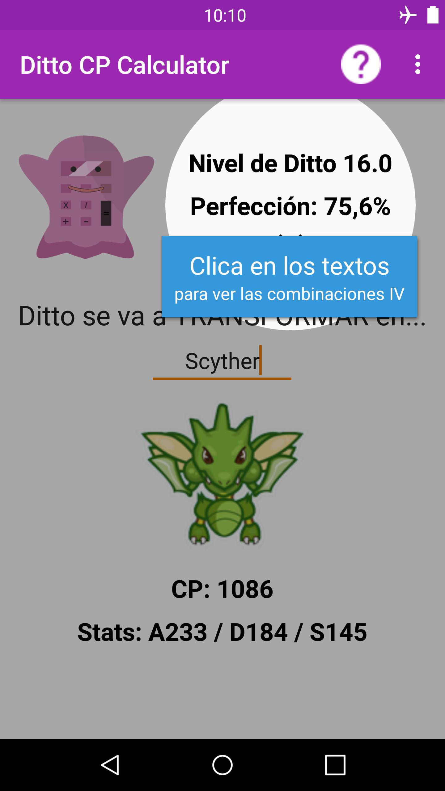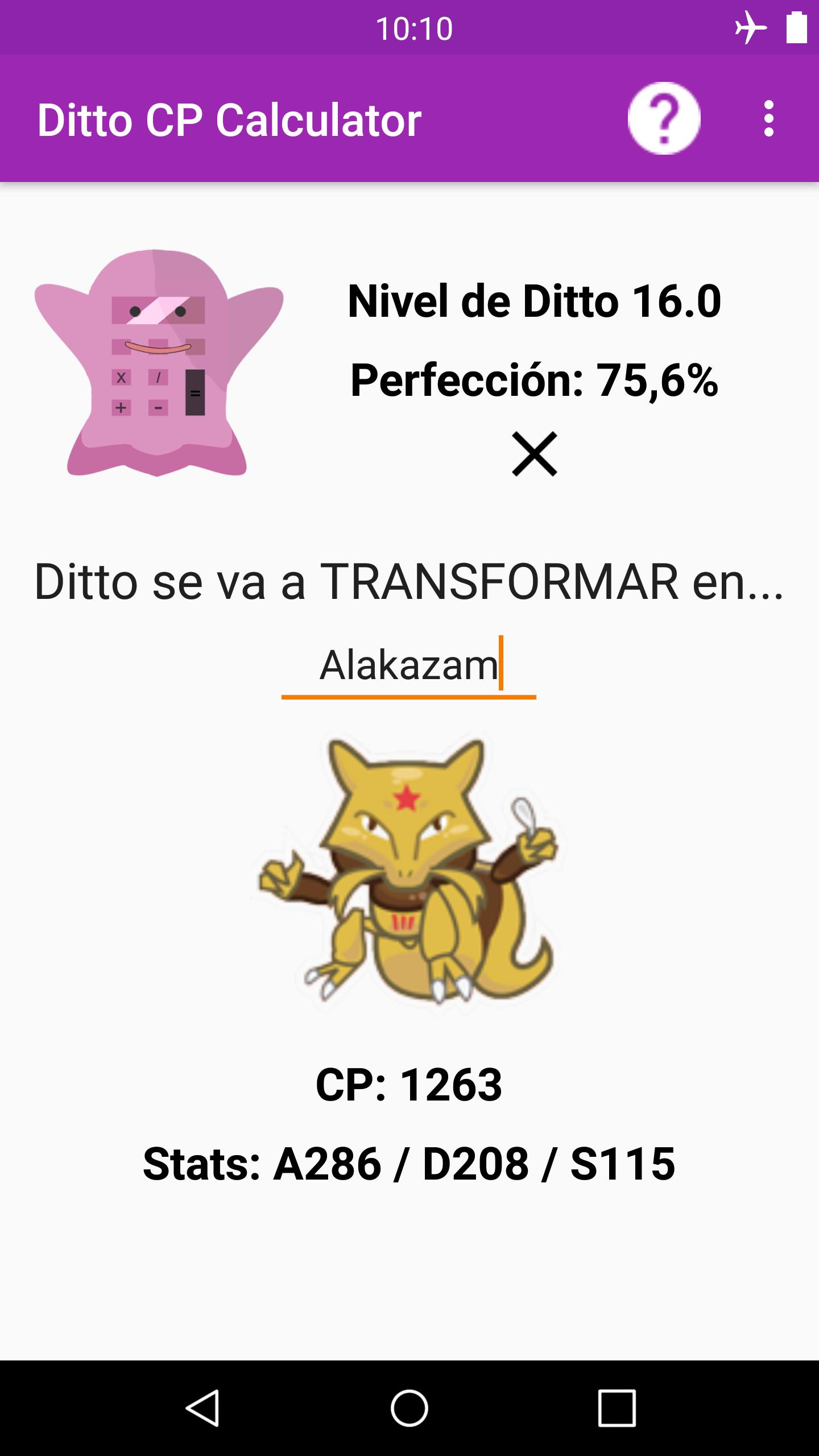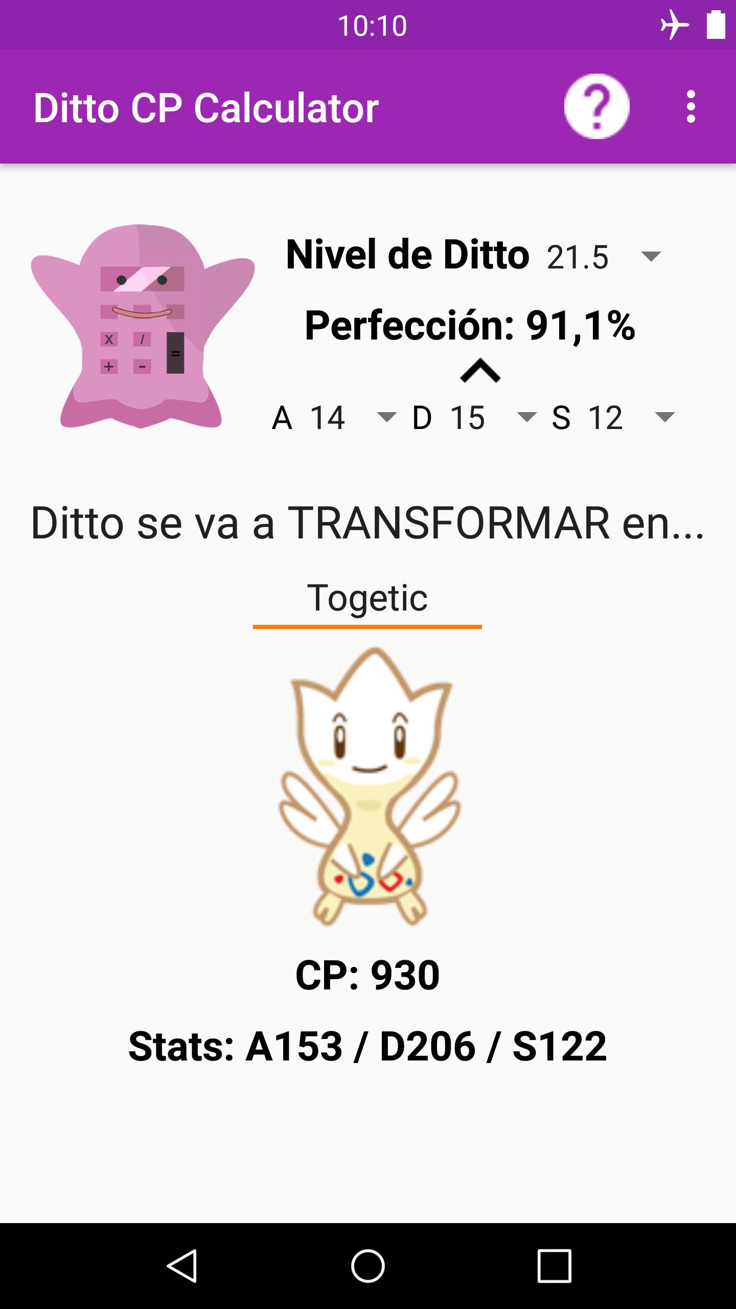Con esta app, podrás calcular el nivel y perfección de tu Ditto para descubrir el CP que tendrá cuando se transforme en el Pokemon enemigo. También podrás ver las stats (estadísticas) que tomará cuando esté transformado.