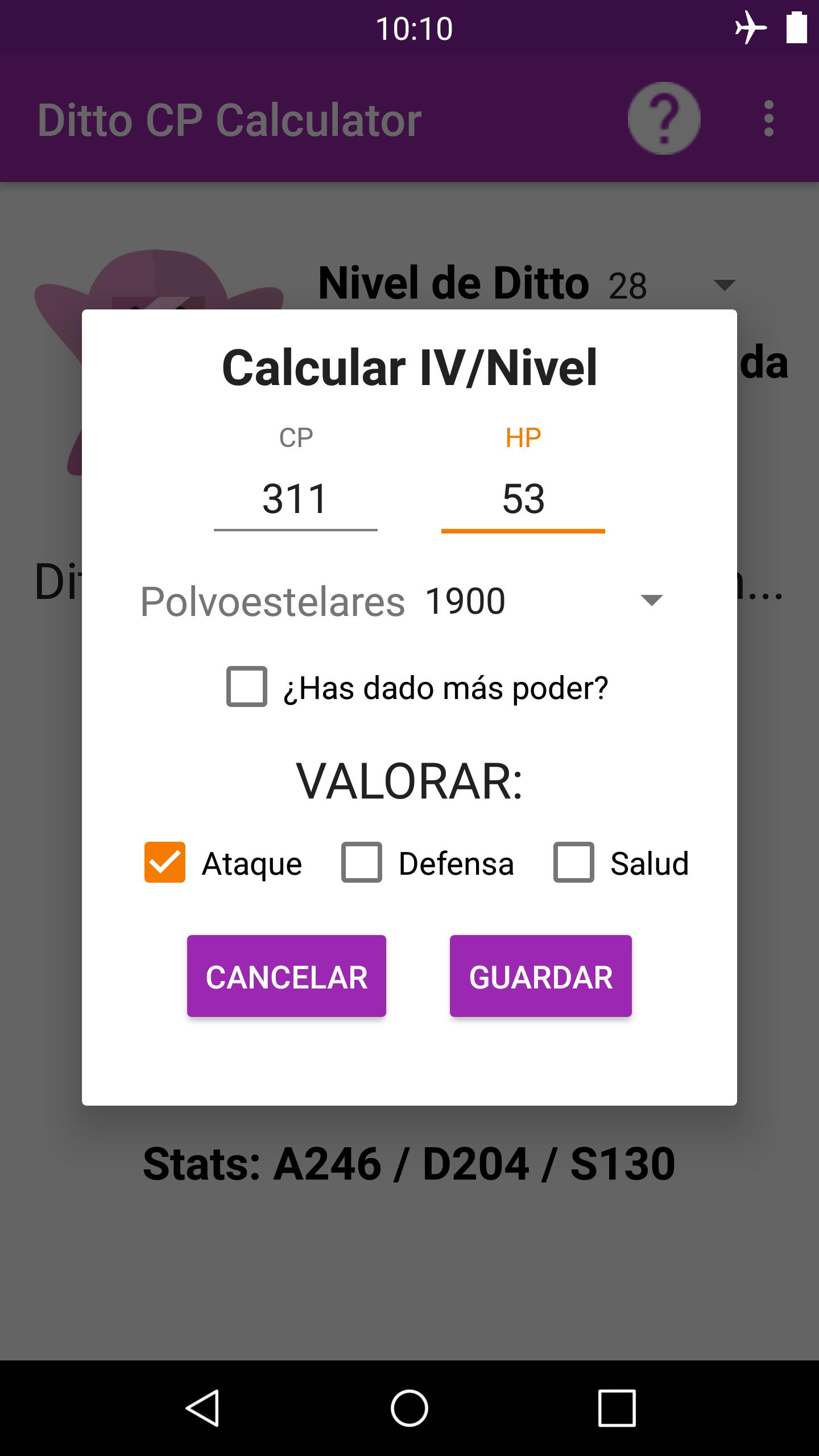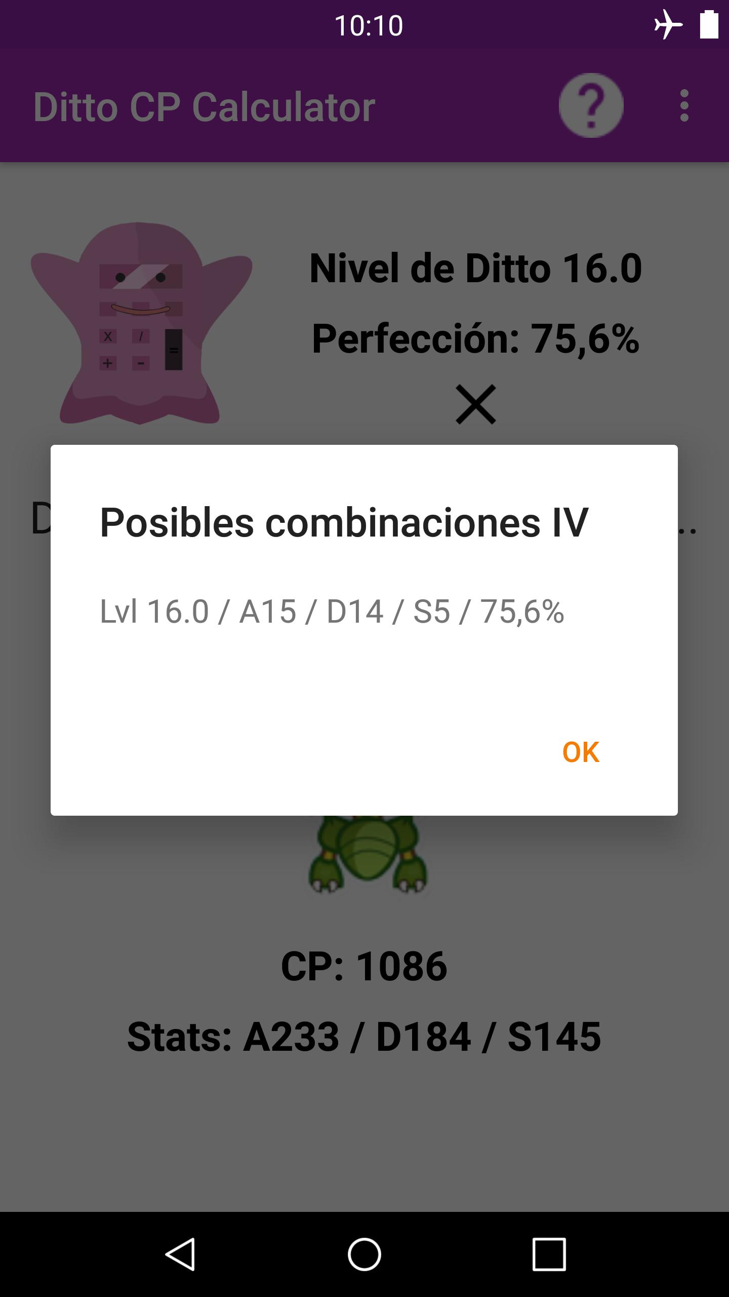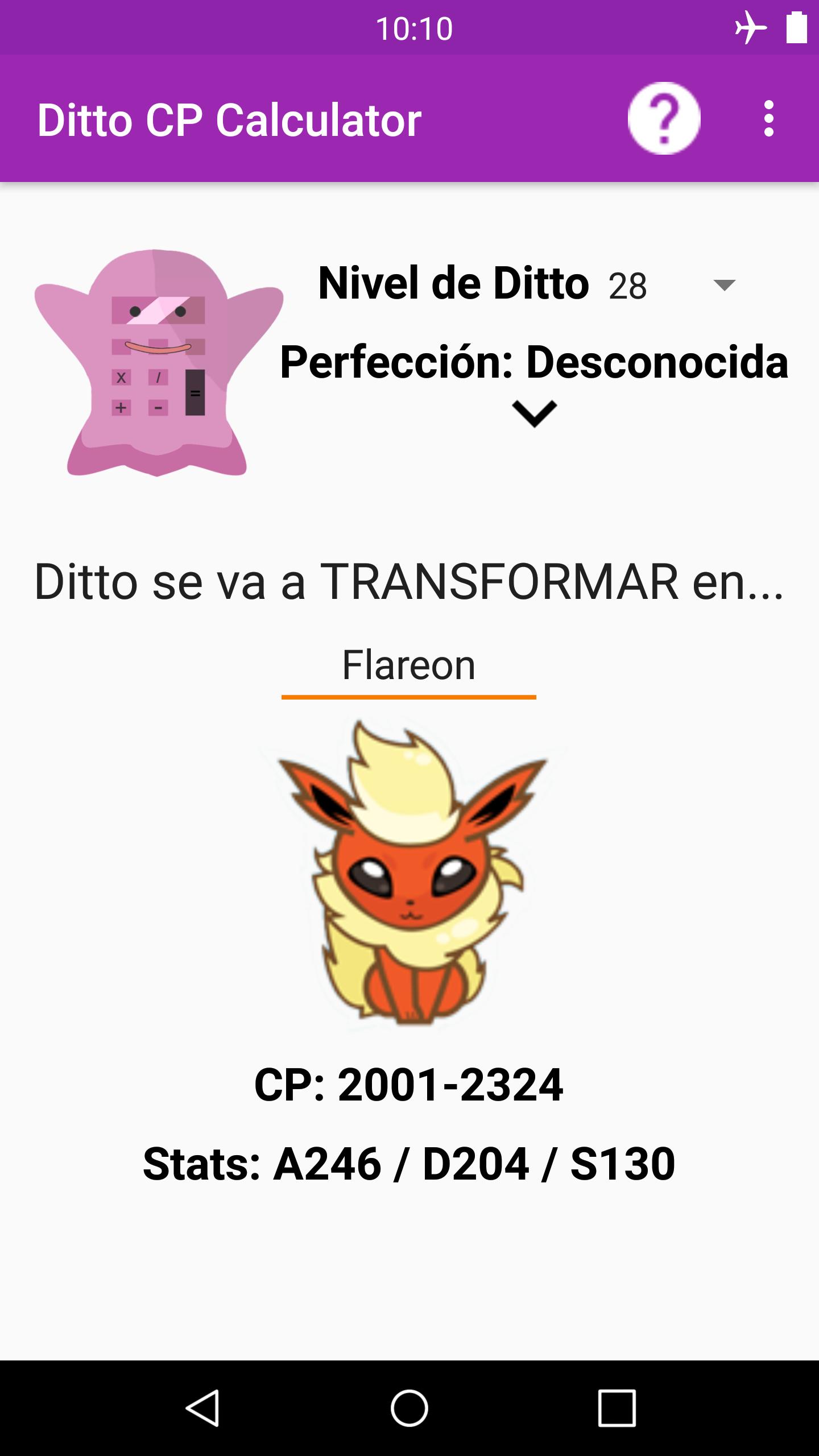 Con esta app, podrás calcular el nivel y perfección de tu Ditto para descubrir el CP que tendrá cuando se transforme en el Pokemon enemigo. También podrás ver las stats (estadísticas) que tomará cuando esté transformado.