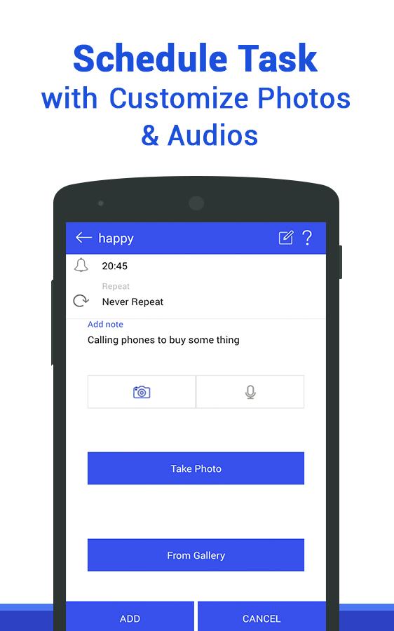• Personalize customization of reminders with images which can either be captured at the moment or uploaded from phone gallery