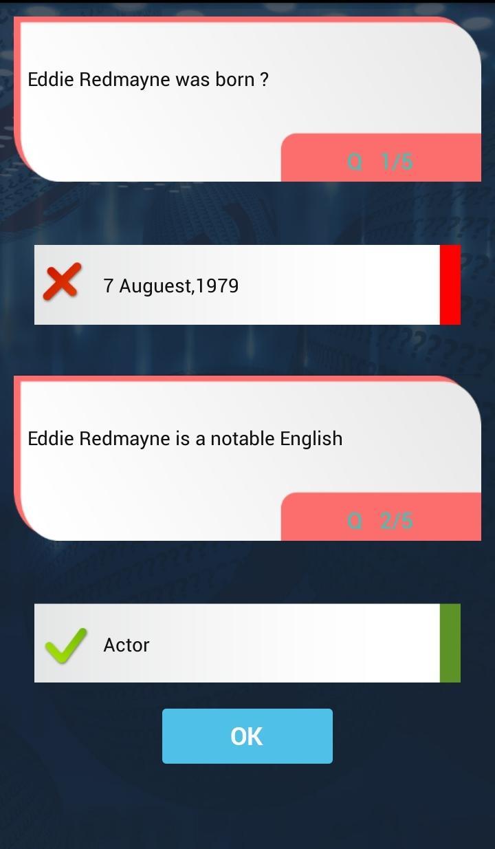 This is a fun quiz game where you answer the questions related to the Eddie Redmayne. There are different levels in Eddie Redmayne quiz game, each level contains many interesting questions about Eddie Redmayne You need to achieve the required criteria to unlock the levels. Eddie Redmayne trivia is interesting, quick and easy to use.