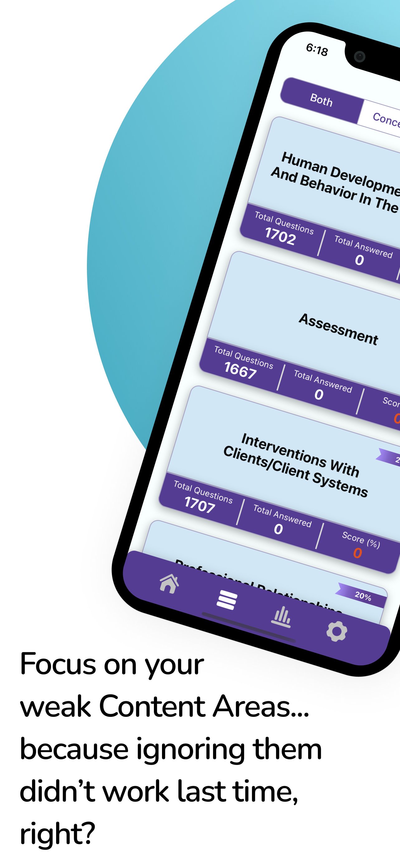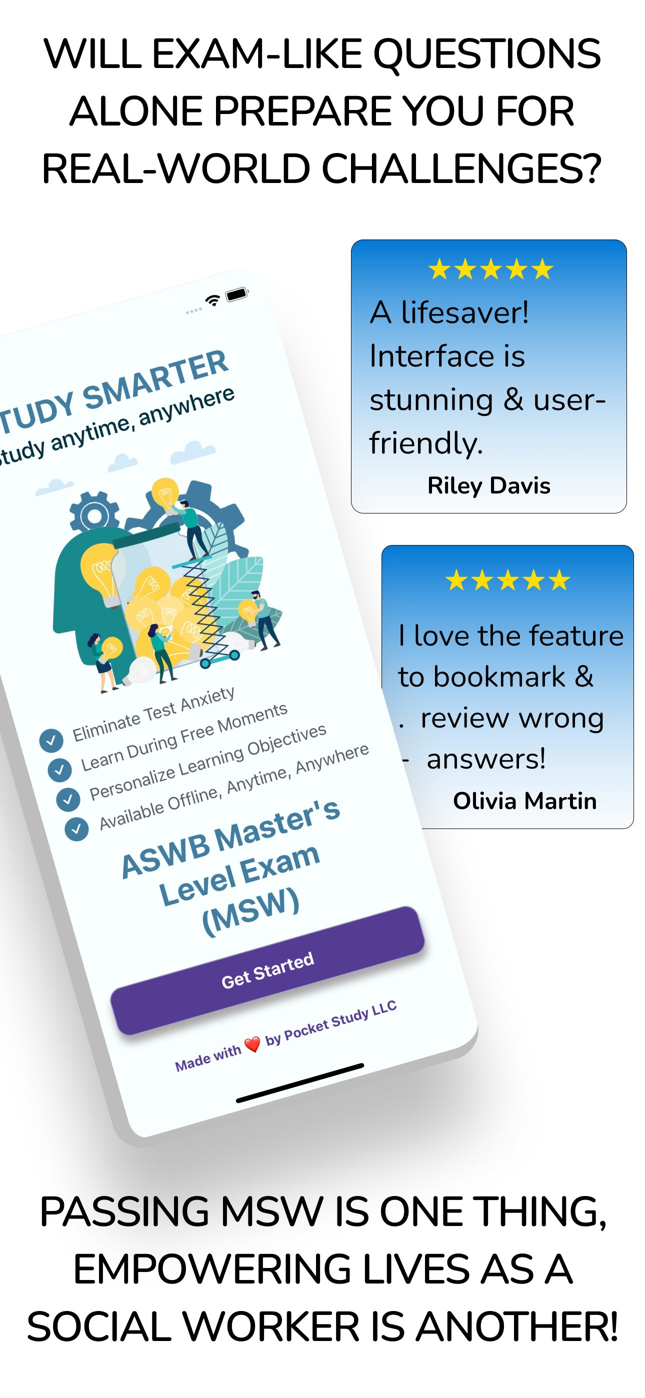برخلاف سایر برنامه‌های آمادگی آزمون ASWB، برنامه مطالعه جیبی MSW ePrep توسط مددکاران اجتماعی دارای مجوز توسعه داده شده است و از طرح محتوای آزمون رسمی ASWB پیروی می‌کند که بیش از 6500 سؤال تمرینی ASWB را ارائه می‌دهد - بزرگترین بانک سؤال در فروشگاه! علاوه بر سؤالات مفهومی، شامل چندین سؤال تمرینی BSW مبتنی بر سناریوهای زندگی واقعی برای همه حوزه های محتوا است تا به شما در تسلط بر آمادگی MSW کمک کند.