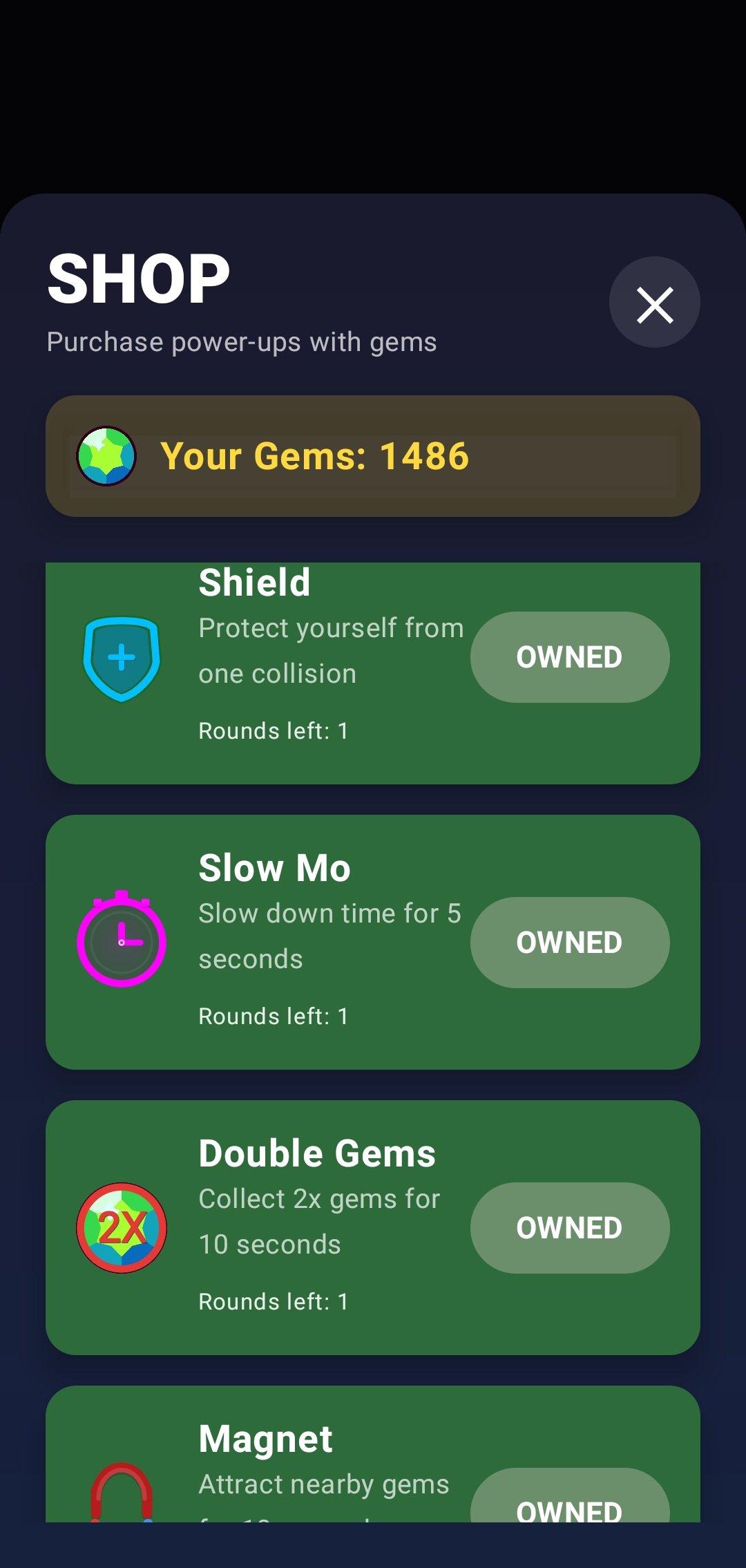 Magnet: Use this power-up to instantly attract all nearby gems, ensuring you don't miss a single one.