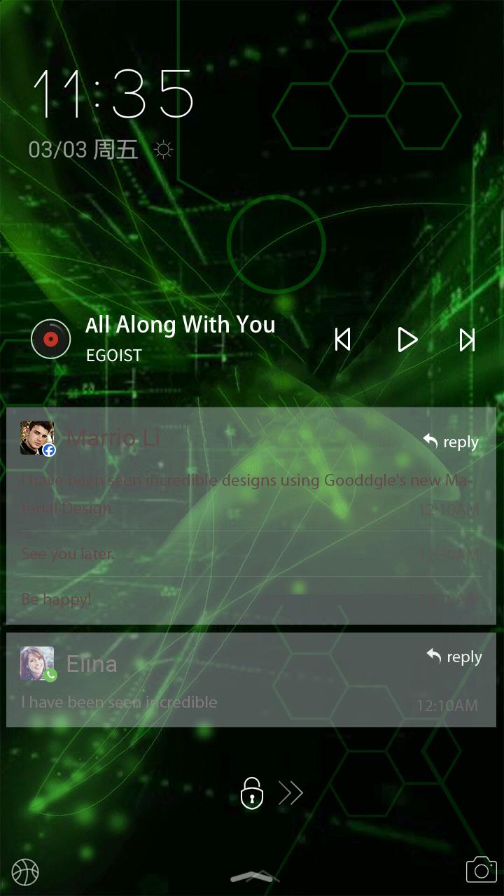 Cool green technology Locker Live Theme, an futuristic high tech locker theme which possesses future nasa lights live wallpaper, Cool green technology lock dynamic screen themes and dark green vert technology sense coolness boys' style elements. Besides, weather app and music widgets based on technology sense and coolness boys' style design are also features of this Cool green technology Locker Theme. Specially designed for people who is keen on technology sense or dark green vert, this Cool green technology theme with future nasa lights background is your best choice! If you want to give your default Android phone some technology sense with futuristic high tech style, or seek coolness boys' style in dark green vert, why not download and apply our Cool green technology live locker Theme? Tons of locker live themes and wallpapers, such as dark green vert and futuristic high tech or coolness boys' style, are created and are waiting for you to download. Install this Cool green technology dynamic theme with future nasa lights live wallpaper for your android device.