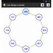 "I can design a counter" is a small CAD program that teaches electrical engineering students studying digital logic how to design a binary counter by example. Use the wizard to specify the length between 2 and 8. Use the Bubble Diagram to simulate and fine-tune the Finite State Machine. The result is shown in the State Transition Table. Below the table, Optimized Boolean expressions suitable for D-Flip Flop implementation are automatically computed and displayed without the use of a Karnaugh Map.Uploaded by