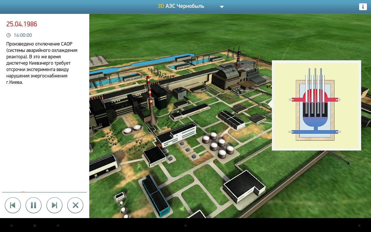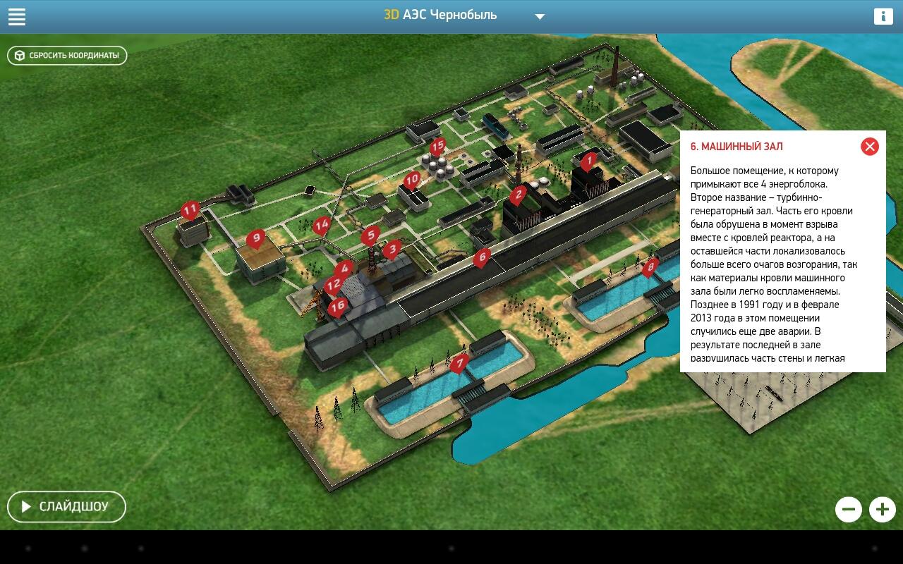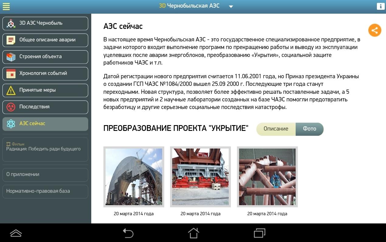 Данное приложение представляет собой 3х-мерную модель объектов АЭС, на которых произошли одни из самых крупных радиационных аварий в мире. В приложении воспроизведена хронология событий, в результате которых произошли инциденты, описаны меры, которые были приняты для устранения последствий аварий, и даны характеристики объектов на текущий момент.