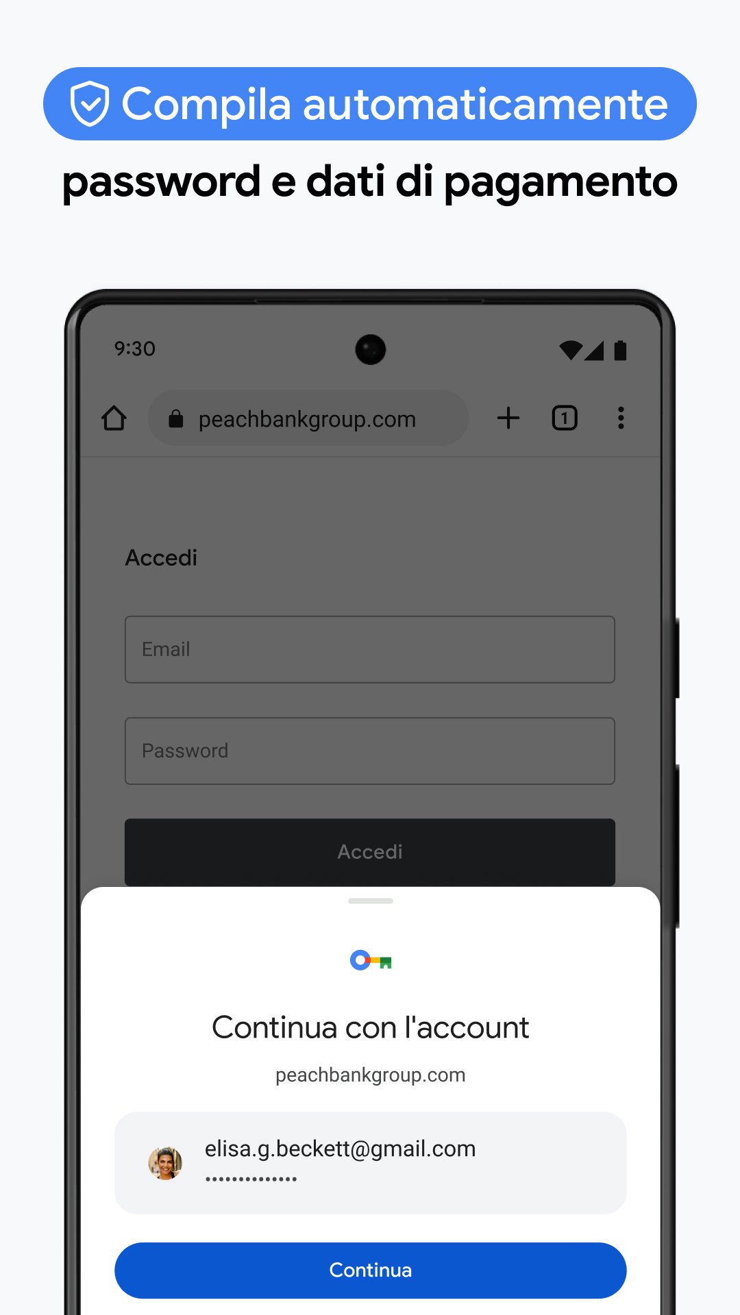• GESTORE DELLE PASSWORD DI GOOGLE: genera e salva in modo sicuro le password per un accesso rapido e ricevi avvisi se le tue password sono a rischio.