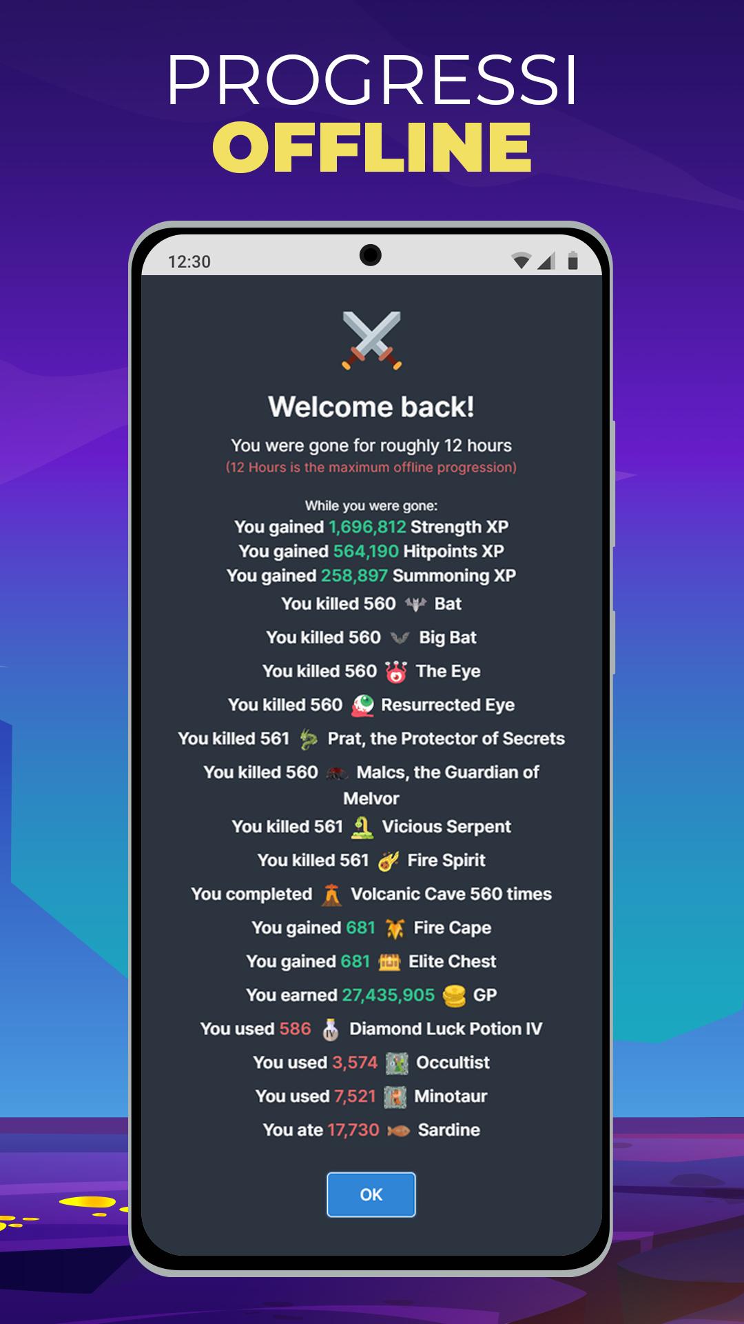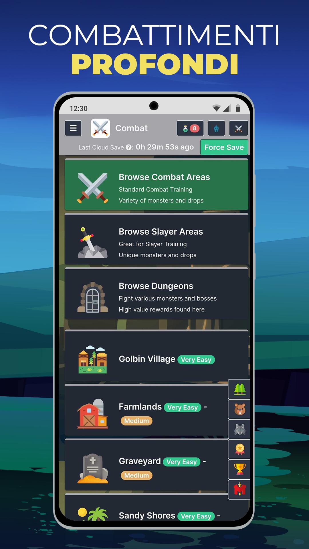 Padroneggia le numerose abilità di Melvor in stile RuneScape con un semplice clic o tocco. Melvor Idle è un gioco di tipo automatico/incrementale ricco di funzionalità che combina un'atmosfera familiare con un'esperienza di gioco tutta nuova. Massimizzare più di 20 abilità non è mai stato così zen. Che tu sia alle prime armi o abbia molta esperienza con RuneScape, oppure se sei semplicemente in cerca di un'avventura articolata ma accessibile che si adatti facilmente a uno stile di vita impegnato, Melvor è un'esperienza di gioco automatica che ti coinvolgerà come nessun'altra.