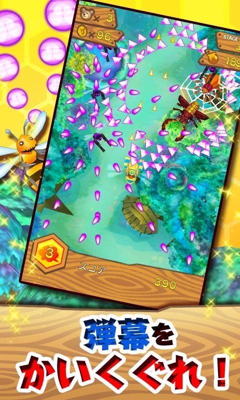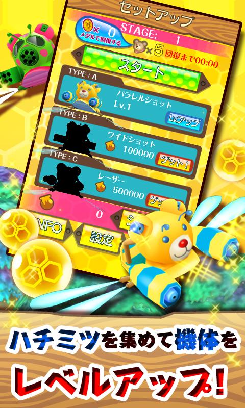 敵を倒してハチミツをGETし、集めたハチミツで自機をレベルアップさせながら、さらに強大なボスに立ち向かおう!!