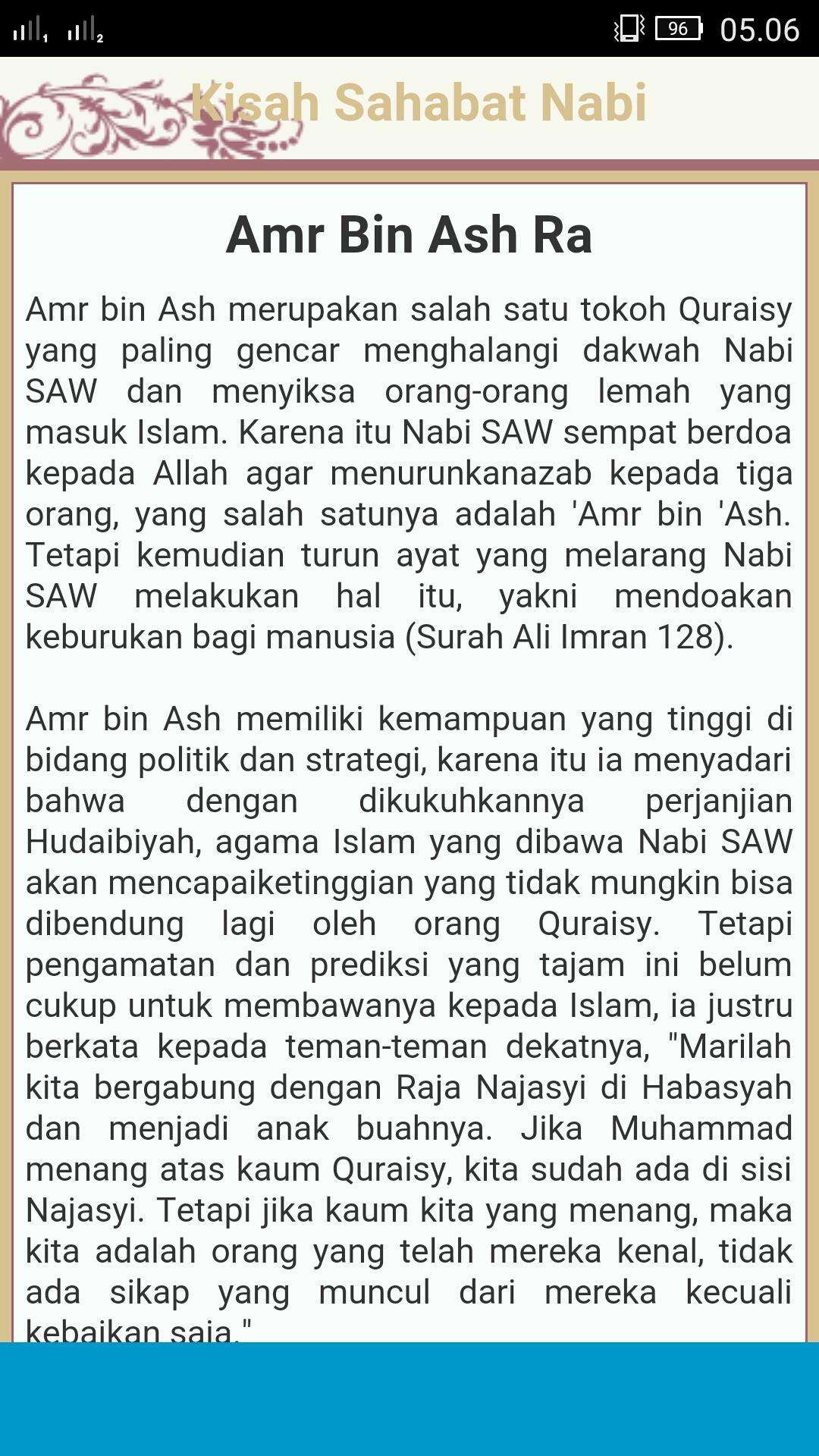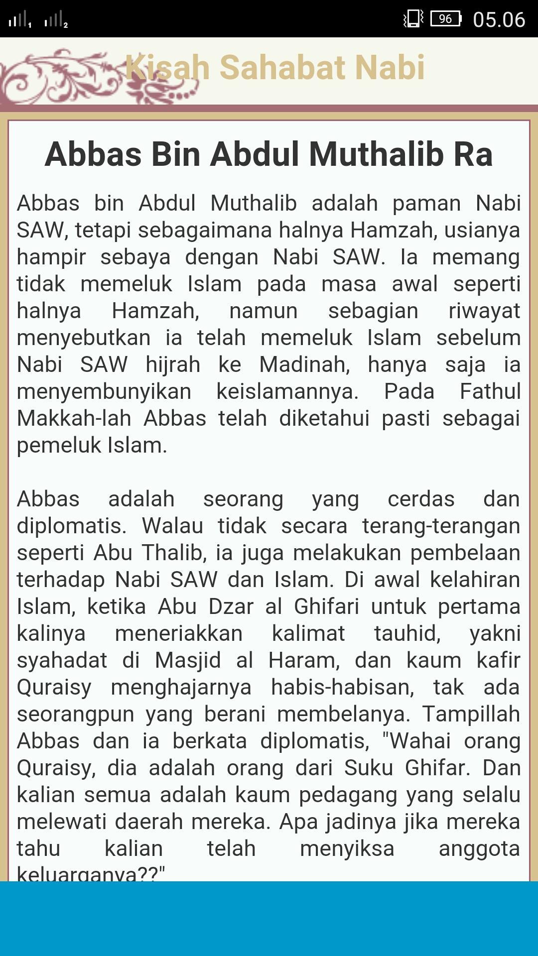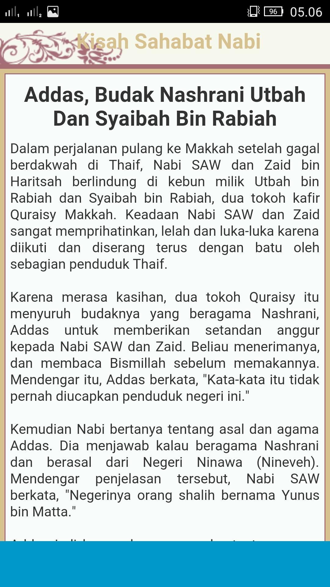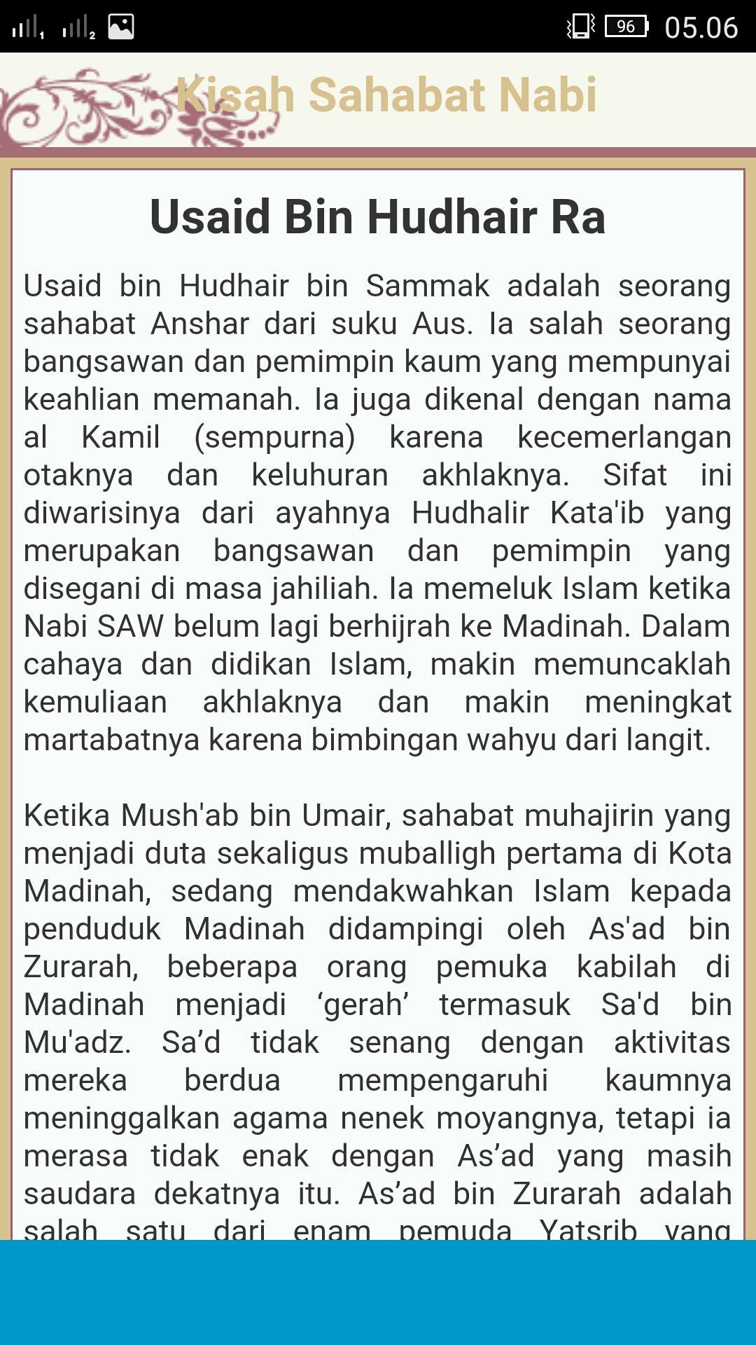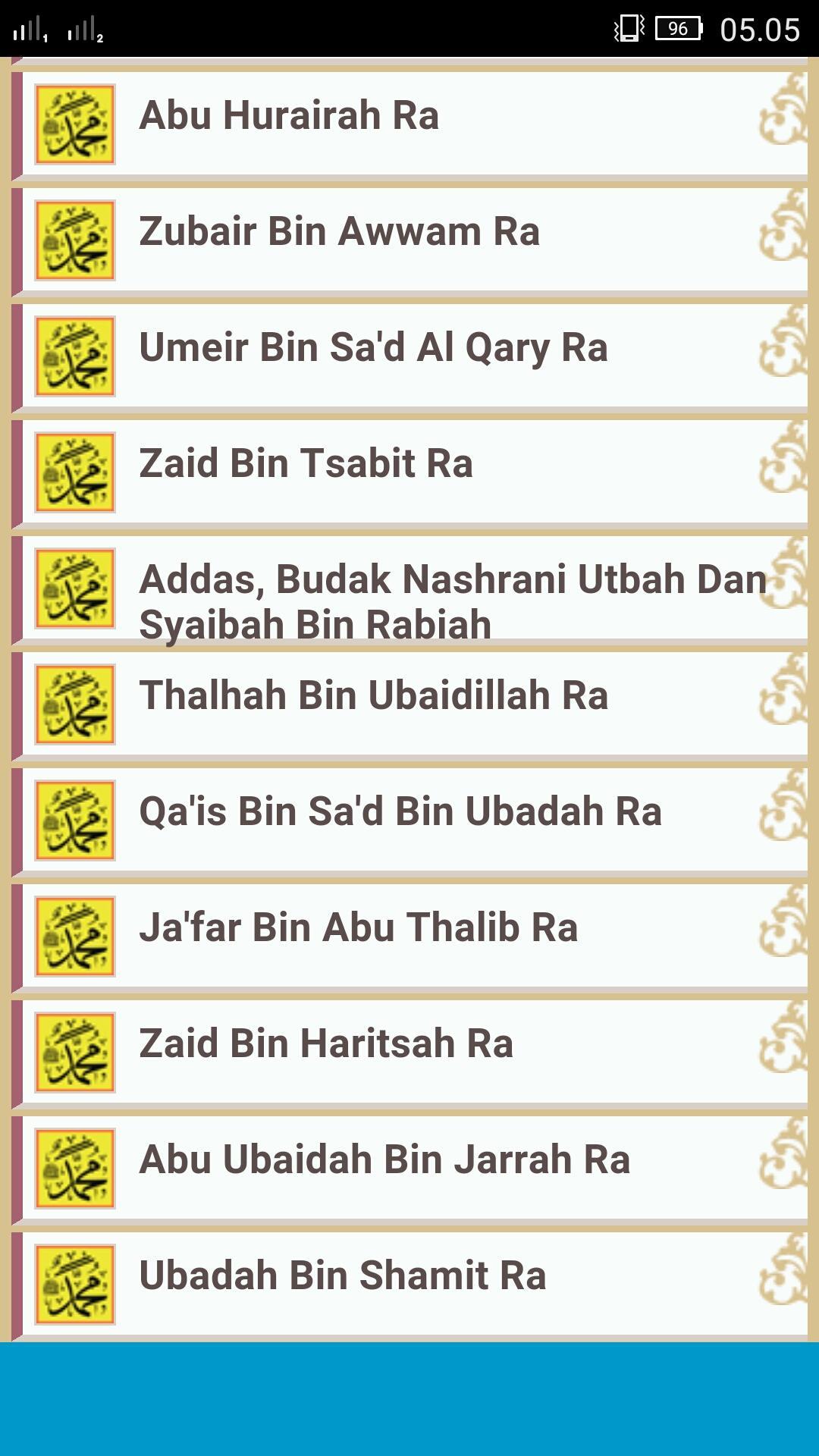 Kisah-kisah Sahabat Rasullulah ini kami kumpulkan dari tulisan-tulisan yang terdapat di Internet. Di dalam aplikasi terdapat 250 Kisah Sahabat Nabi, dengan teladan pada Sahabat Nabi Muhammad SAW, sehingga bisa menumbuhkan kecintaan kita kepada mereka, dan akhirnya kecintaan kepada Nabi Muhammad SAW.