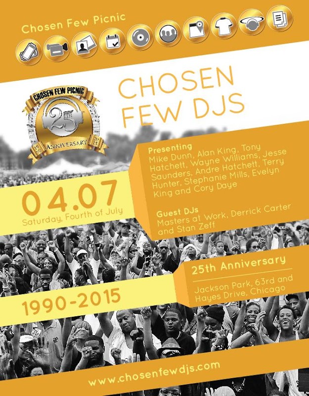 The Chosen Few Old School Reunion Picnic is the world's largest one-day house music festival, drawing more than 40,000 fans to Chicago each July. This year, the 25th anniversary picnic on July 4 features performances by guest artists Stephanie Mills, Evelyn Champagne King, Cory Daye, plus sets by guest DJs Masters At Work--Louie Vega and Kenny Dope, Derrick Carter, Stan Zeff, Keith Fobs and Greg Gray.Last updated on May 11, 2016