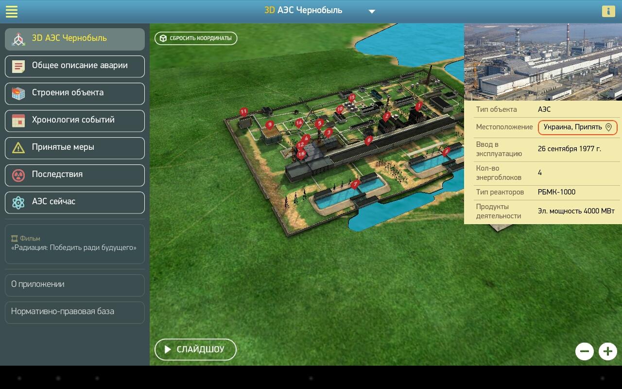 Данное приложение представляет собой 3х-мерную модель объектов АЭС, на которых произошли одни из самых крупных радиационных аварий в мире. В приложении воспроизведена хронология событий, в результате которых произошли инциденты, описаны меры, которые были приняты для устранения последствий аварий, и даны характеристики объектов на текущий момент.