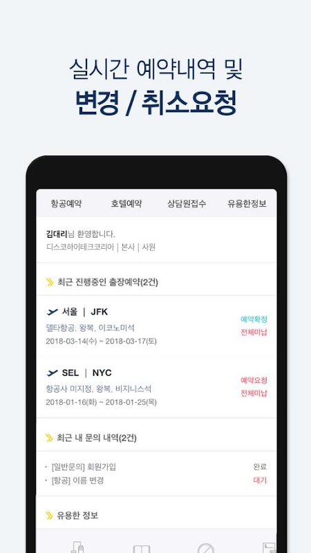 - 예약 내역 실시간 확인, 취소/변경, 발권요청 가능