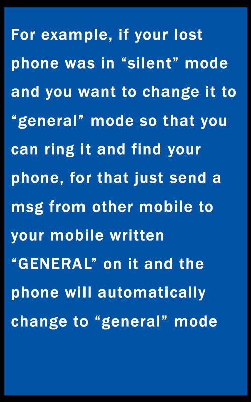 NOW YOUR MOBILE IS READY TO HELP YOU WHEN IT IS LOST IN SILENT MODE OR YOU CAN NOW CHANGE THE MODE AS YOU LIKE FROM OTHER MOBILE.