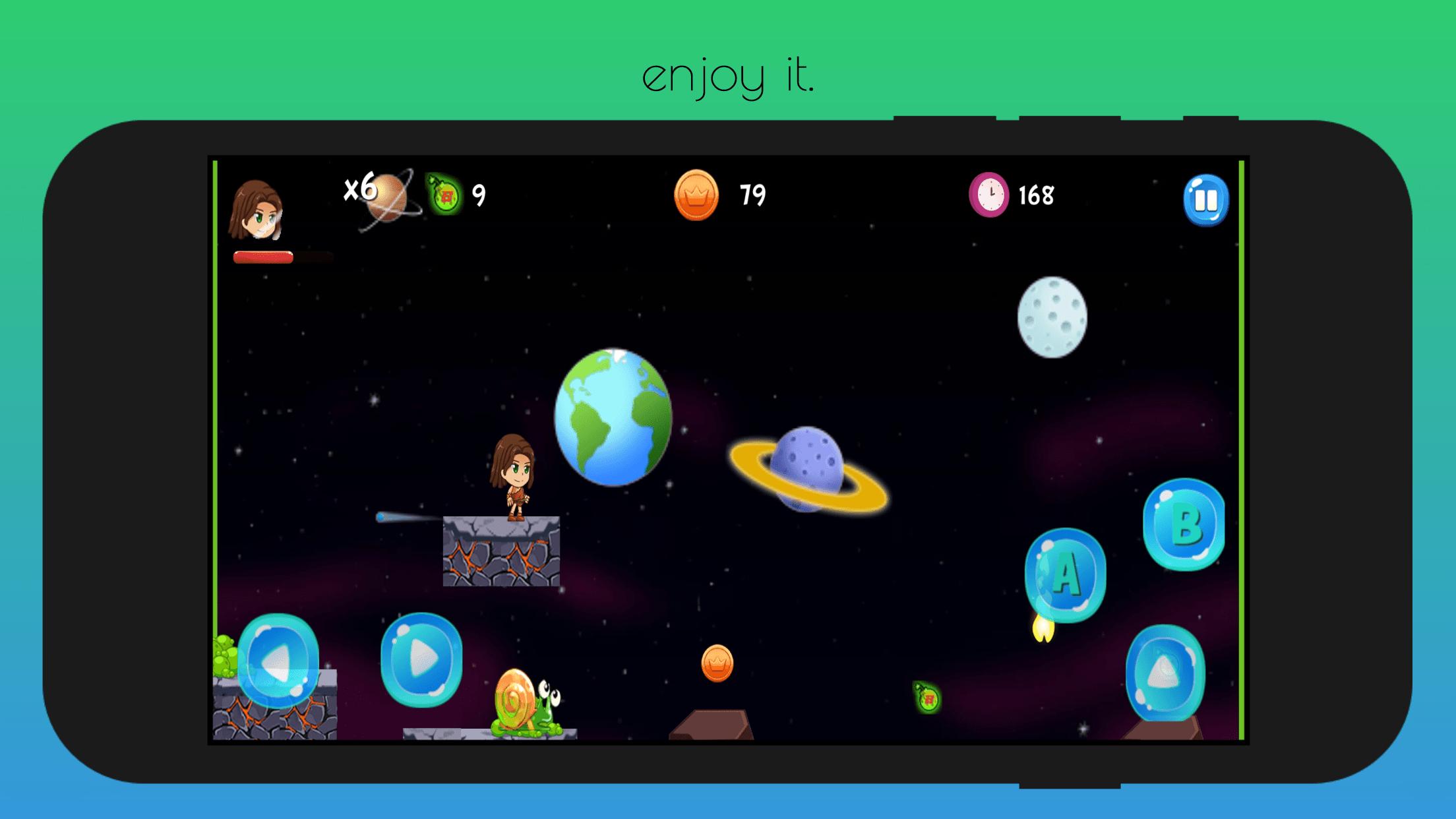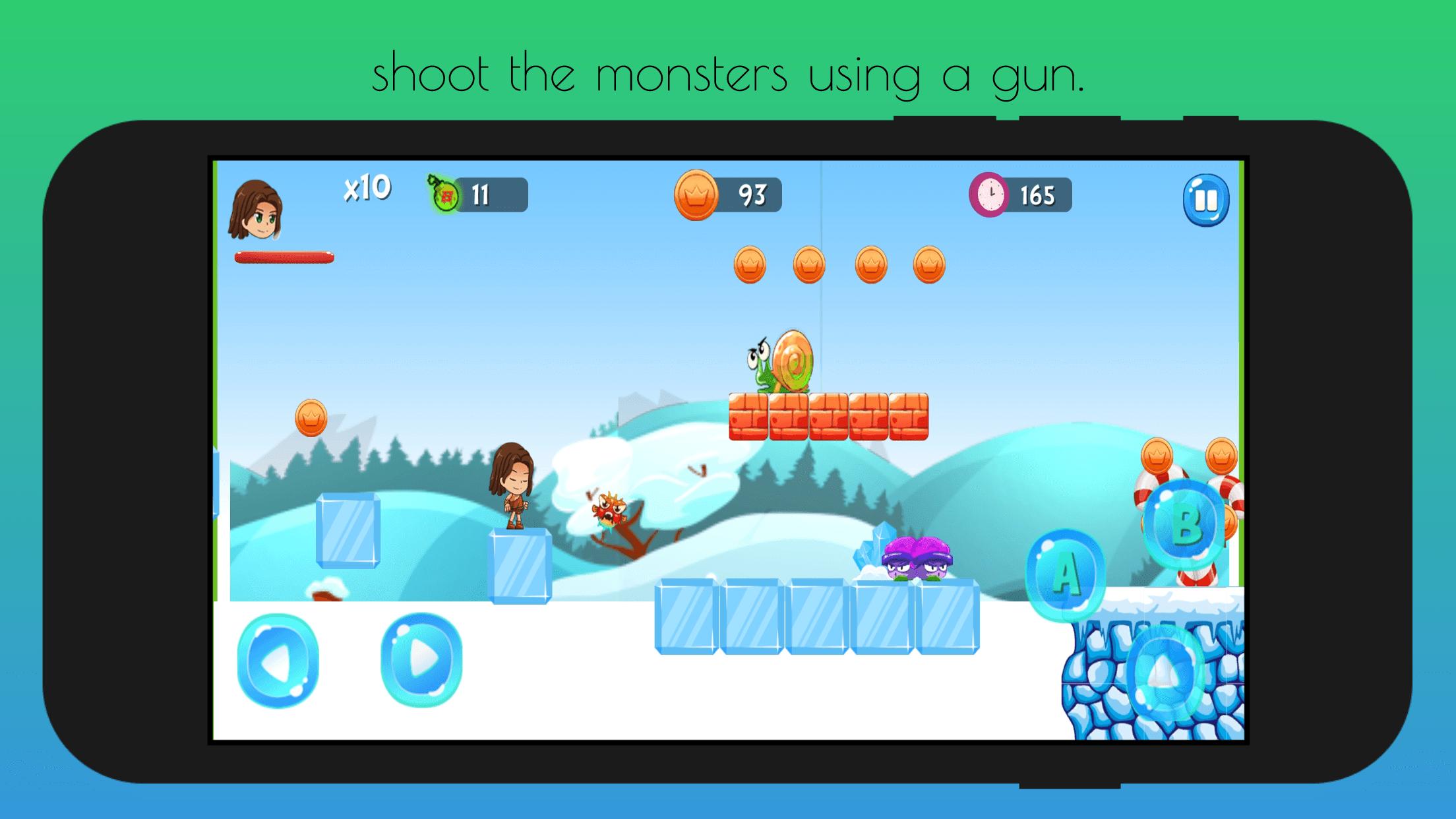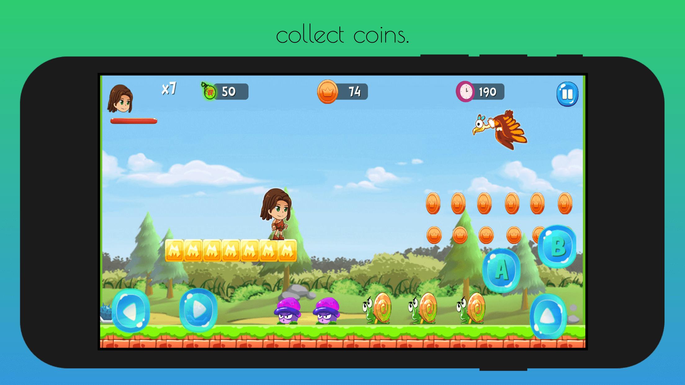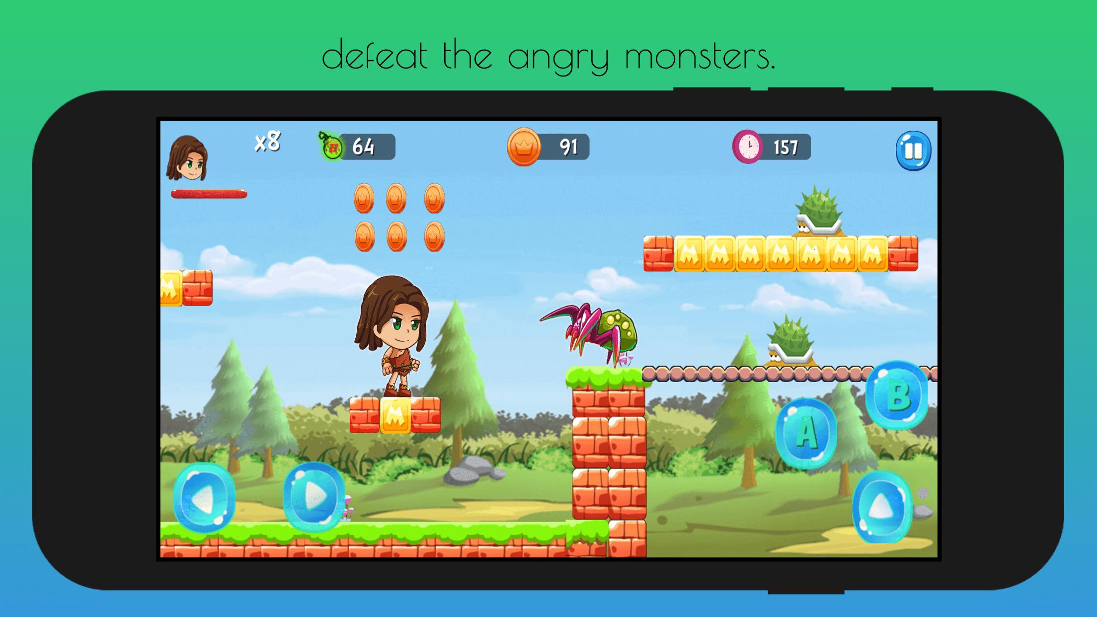 feel free to start an adventure through the jungle with runner boy, defeat the monsters, eat fruits jump, run, climb the walls...