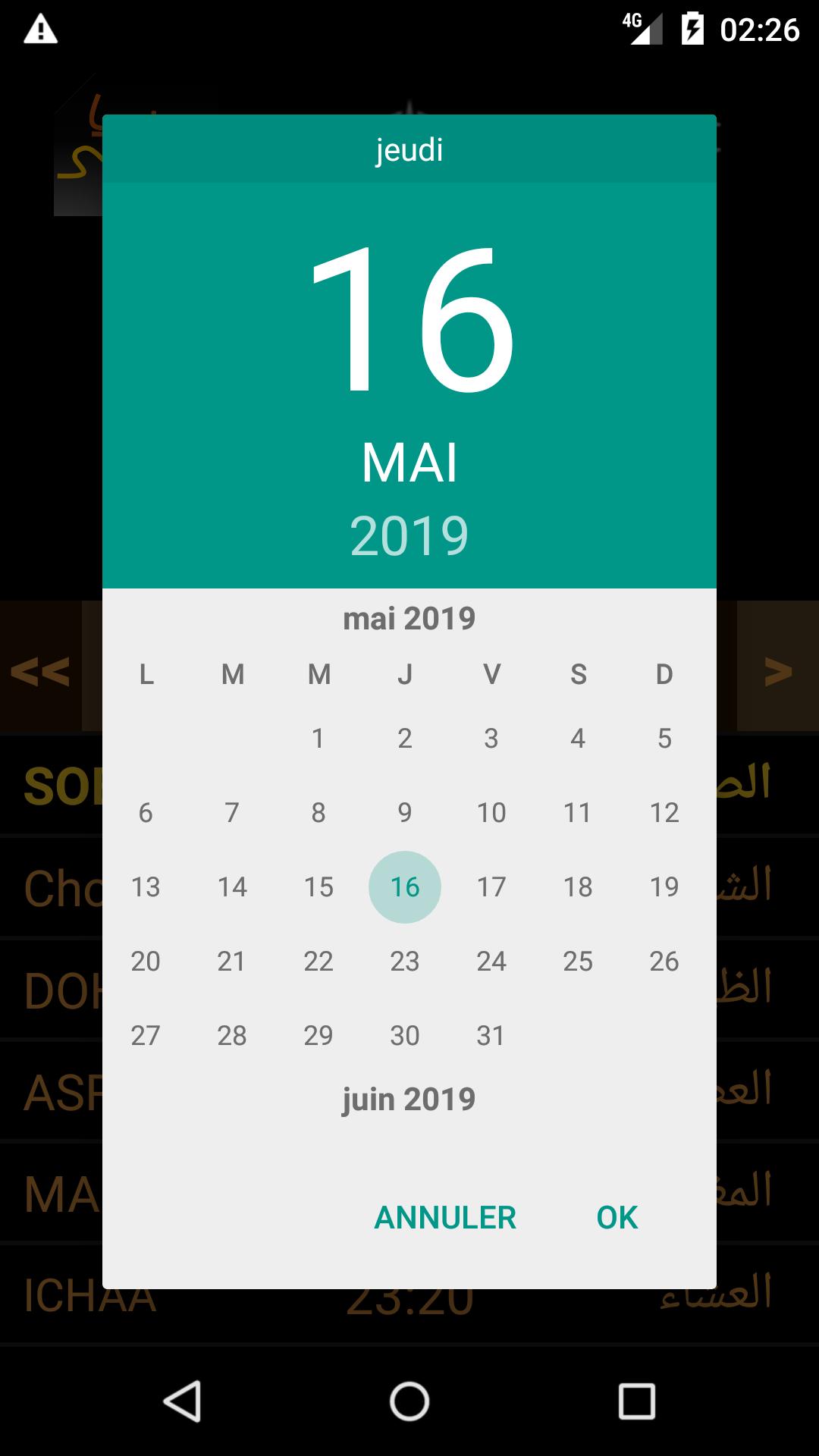 The prayer times are displayed according to the date.