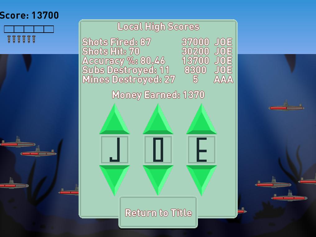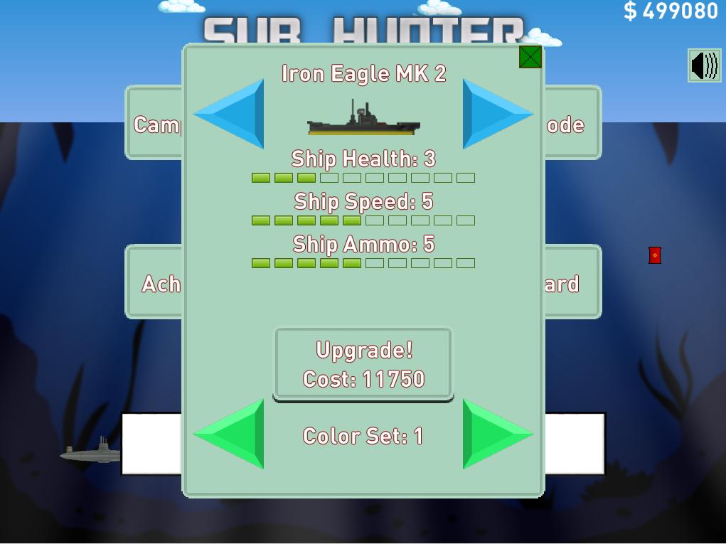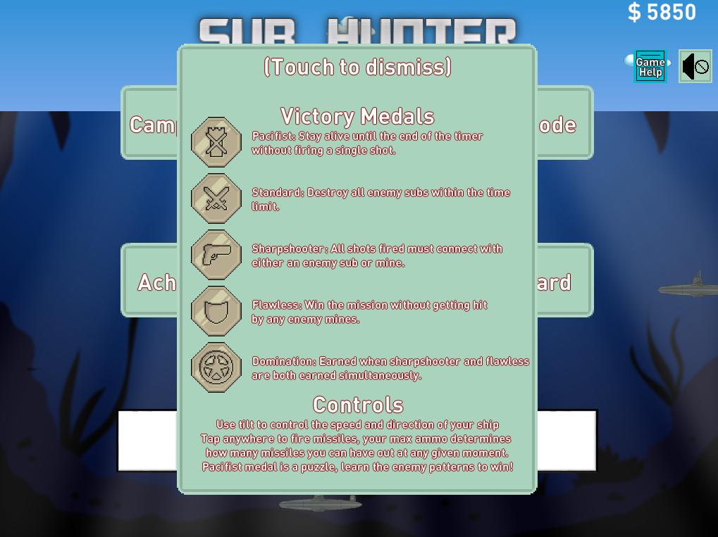 Welcome to Sub Hunter! Please enjoy the 12 stage campaign and try to earn all the victory medals! Also try endless mode for a more arcade style action! Use in-game money to upgrade your vessels to unlock their maximum potential!