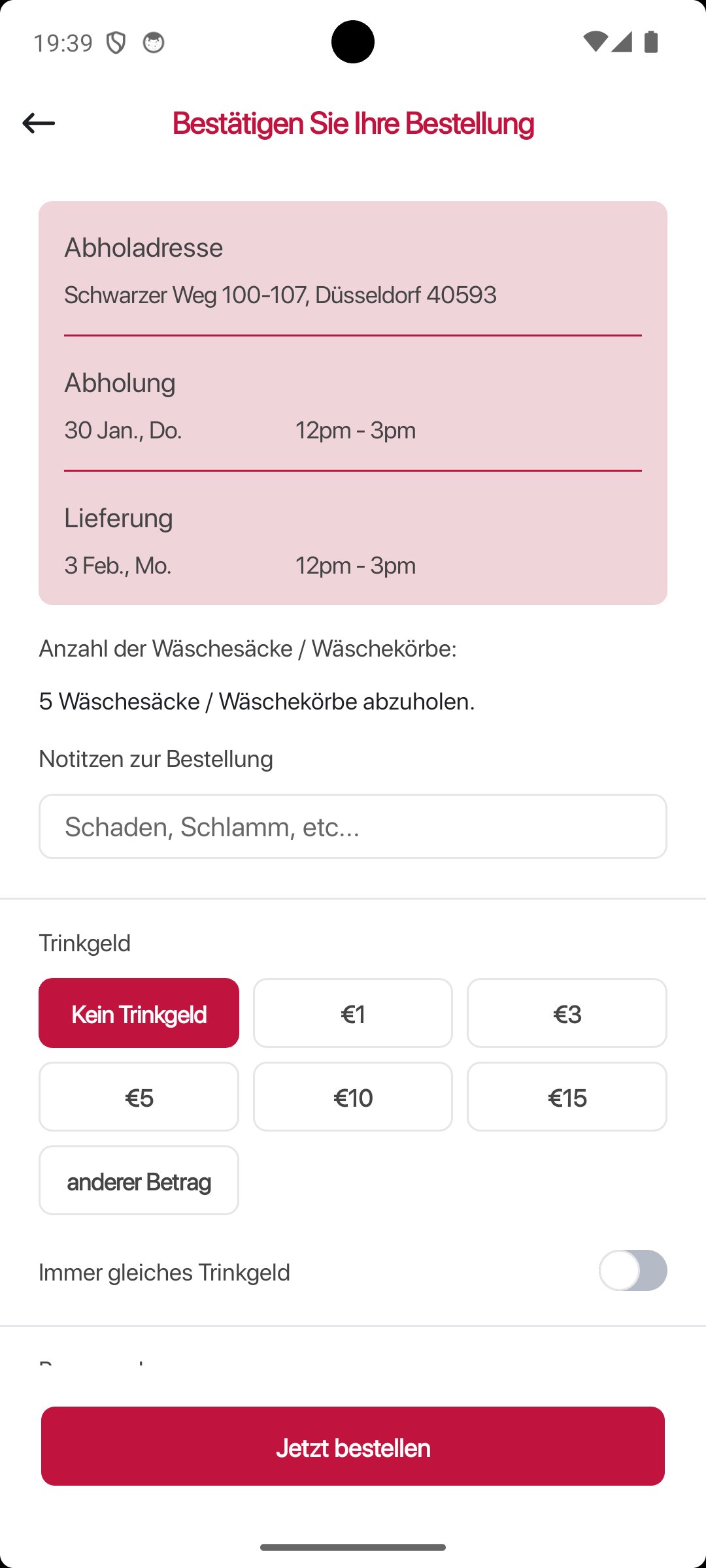 Our drivers travel throughout the greater Düsseldorf area every day and collect the items of clothing that need to be cleaned along their route and bring them back after cleaning. Choose from our convenient 2-hour pickup and delivery time slots between 12:00 p.m. and 10:00 p.m.
