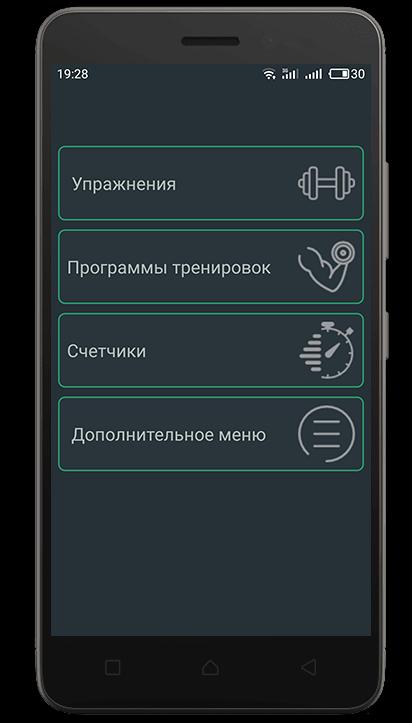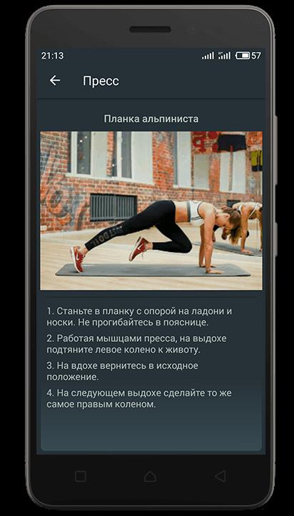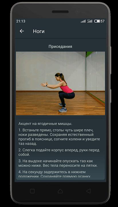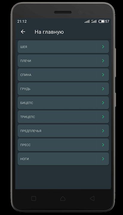 В приложении представлены упражнения для тренировки дома на такие группы мышц: