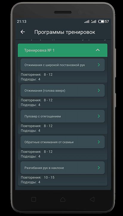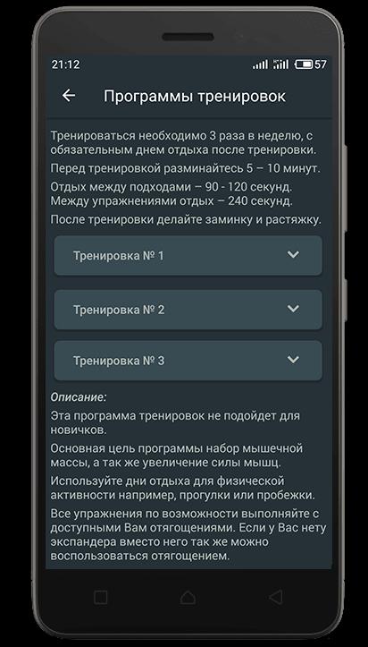 В разделе который называется – упражнения, большой выбор упражнений для тренировок дома, которые дадут Вам возможность проработать все группы мышц дома не используя тренажеры, гантели. В приложении достаточное количество упражнений для домашних тренировок, которые не требуют никакого оборудования. Что бы выполнять эти упражнения в домашних условиях можно использовать доступные Вам отягощения.