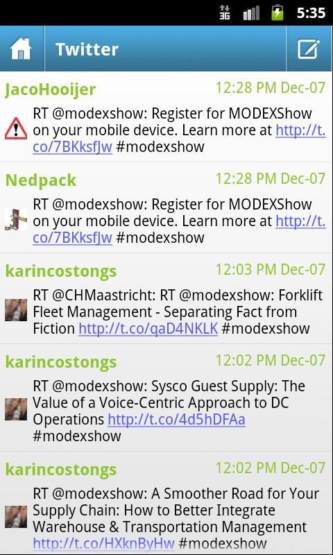 Get connected with the MODEX 2012 Mobile App. MODEX 2012 is the newest expo for the manufacturing, distribution and supply chain industries, being held February 6 - 9, 2012 at the Georgia World Congress Center in Atlanta, GA. Quickly view exhibitor information, a schedule of MODEX and collocated events, conference sessions and speaker information, and a map of the show floor.