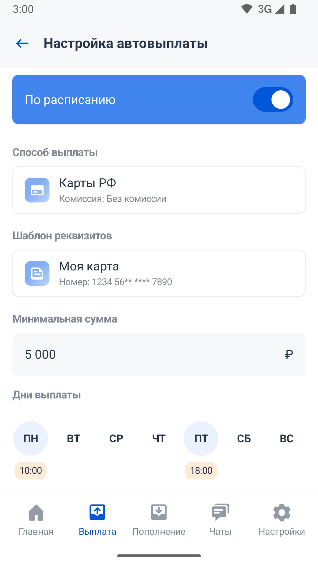 1. "Otomatik günlük" veya "Bireysel bir programa göre" Sberbank kartına çekilme komisyonu olmadan ödemeler (diğer bankaların kartlarına, komisyon transferden 19 ruble), hafta sonları ve tatil günleri hariç, minimum bakiye 100 ruble, ödeme sıklığı 100 ruble. Bakiyeden borçlandıktan sonra, cari gün saat 23: 59'a kadar karta yansıtılacaktır.