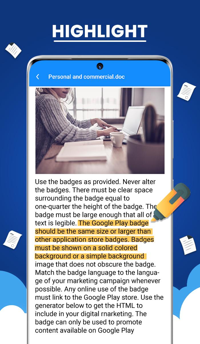 Herhangi bir belgeyi okumak veya düzenlemek için her zaman yanınızda dizüstü bilgisayara ihtiyacınız yoktur. Cep telefonunuzu açın ve herhangi bir belgeyi okumaya ve düzenlemeye başlayın. Belge görüntüleyici, daha sonra kolayca görüntüleyebilmeniz için, klasör yapısı görünümündeki tüm belge dosyalarının yönetilmesine ve düzenlenmesine yardımcı olur. Pdf dönüştürücü, herhangi bir belgeyi pdf'ye dönüştürmenize yardımcı olur.