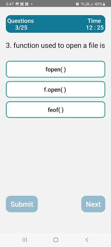 Bu Bilgisayar Bilimi test uygulaması, kullanıcının konu hakkındaki bilgilerini sürekli geliştirebilmesi için mümkün olan en iyi şekilde tasarlanmıştır. Bu Bilgisayar Bilimi test uygulaması, tüm alt, orta ve yüksek seviyeler için uygundur, çünkü bu uygulama, kullanıcıyı temel seviyeden en yüksek seviyeye kadar test etmeye yönelik soruların bir kombinasyonunu taşır. Her seviyedeki sorular rastgele gösterilecektir. Bir öğrenci/kullanıcı hata yaptığında uygulama doğru cevabı gösterir ve gösterir.