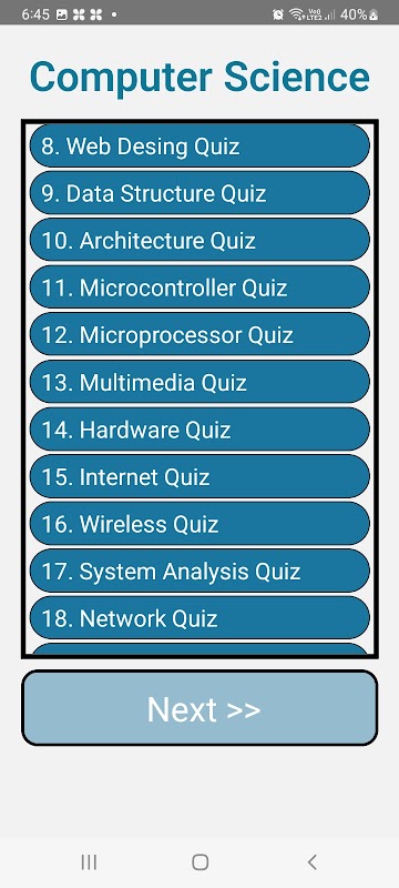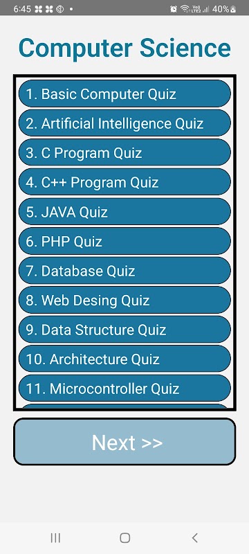 Bu uygulama Bilgisayar Bilimi becerilerinizi test etmek için geliştirilmiştir. Bu, konuyla ilgili zekanızı test eden çok sayıda ilginç soruyla doldurulmuş en yeni ve harika yeni eğitim uygulamasıdır. Bunlar çok çeşitli konuları kapsamaktadır.