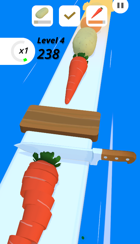 Addictive gameplay Slice it. It is fun to play and easy to control. Chop the vegetables and fruits to complete the levels. There are different types of knife you can buy in the shop with the coins which you collect in the game.Last updated on May 6, 2021