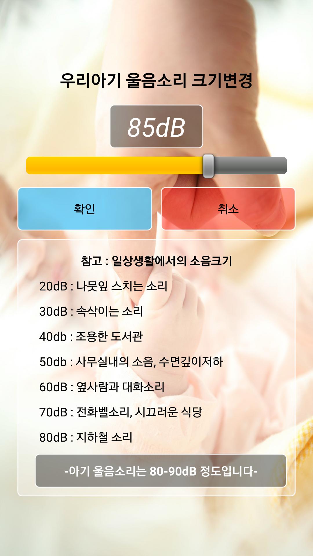 4. 우리 아기 울음소리 크기를 설정한다. (뭐 보통은 80-90 dB 정도라고 하네요)