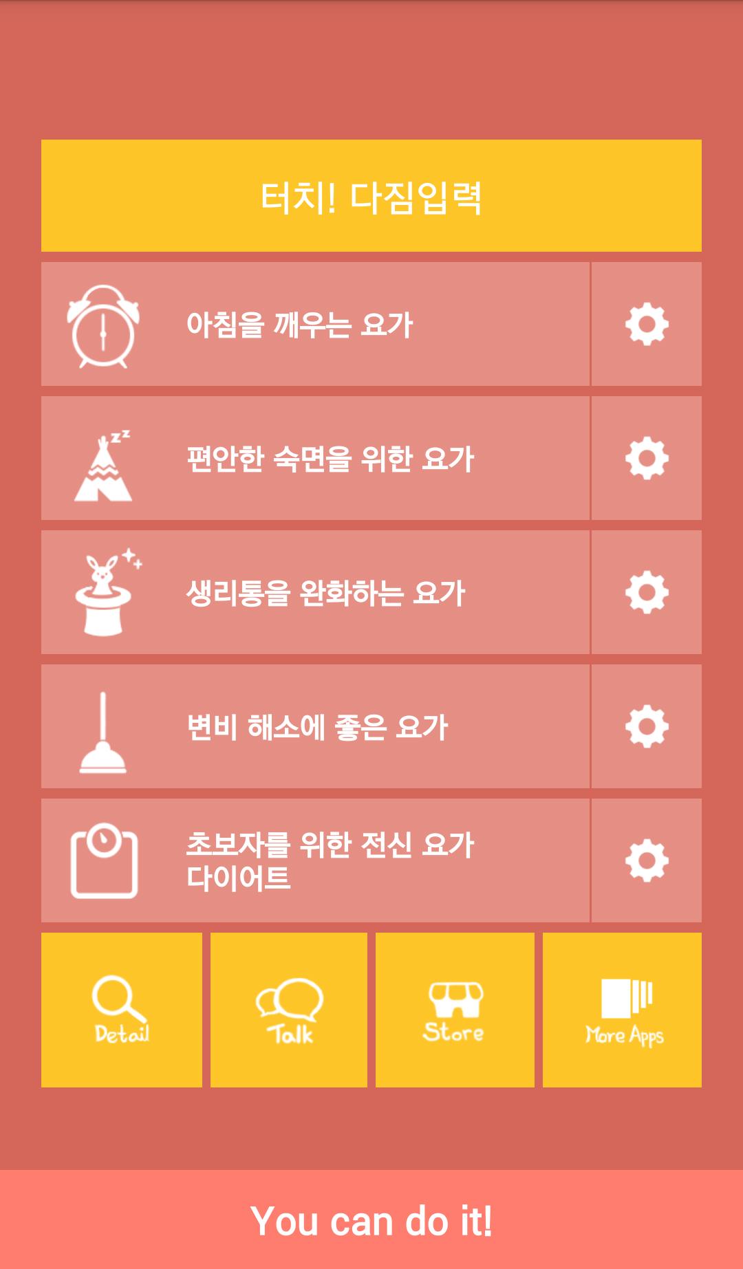 기상, 취침전, 생리통, 변비, 다이어트 5가지의 상황에 효과적인 자세를 모아 사용자는 상황에 맞는 요가자세를 쉽게 선택할수 있습니다.