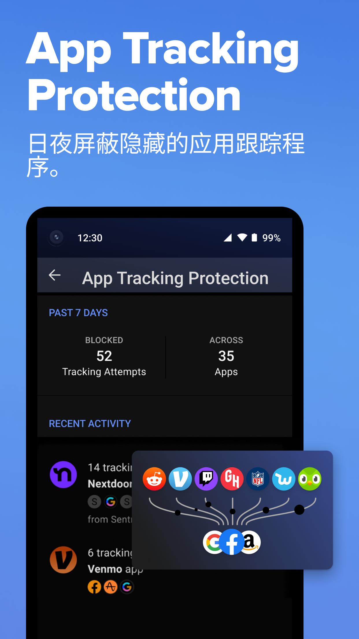 封鎖其他應用程式中隱藏的追蹤程式,提供日夜不間斷的防護,以 App Tracking Protection 防止第三方公司入侵你的隱私。此功能提供 VPN 連線,不過是在你的裝置上本機作業,不會收集個人資料。透過應用程式設定選單,即可加入免費測試版的私密等候清單。